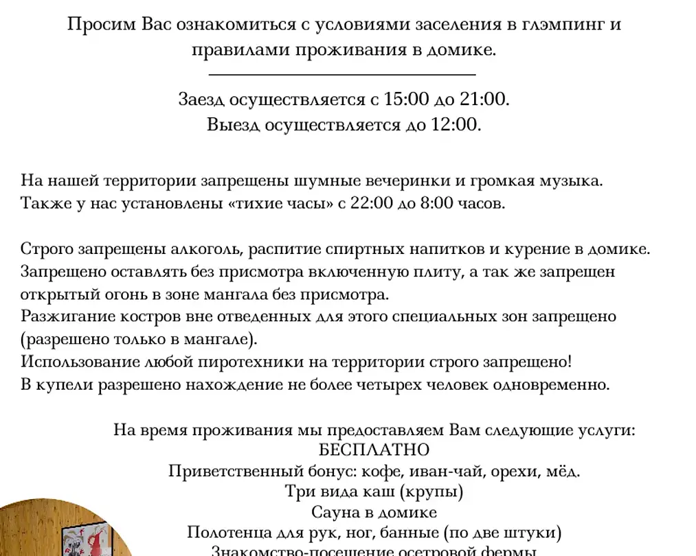 Заселение гостей осуществляется только при условии их согласия с правилами безалкогольного отдыха.