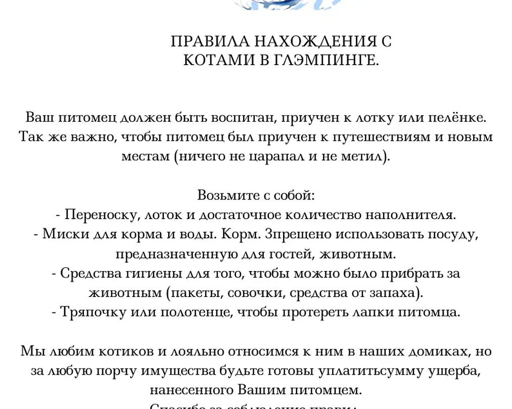 - В глэмпинге доступно проживание с кошками и собаками до 10 кг за дополнительную плату, при условии соблюдения гигиенических правил: гости должны иметь при себе переноску, корм, посуду и полотенца, пеленки. За порчу имущества будьте готовы уплатить сумму ущерба, нанесенного вашим питомцем.