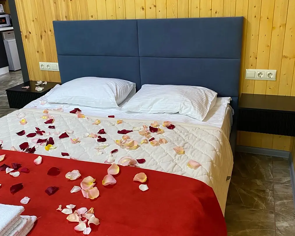 Только для Вас: заезд и выезд в удобное время (после торжества свадьбы или в вечернее время), домик и купель в лепестках роз, цветы, легкий ужин (фрукты, мясная (халяль) и сырная нарезка), безалкогольные напитки.