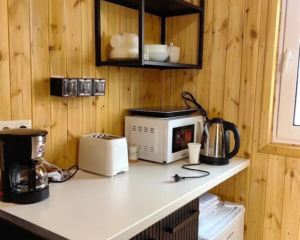 Уютный четырехместный домик Гармония с сауной для спокойного семейного отдыха. В домике есть небольшая кухонная зона со всей необходимой техникой (чайник, плита индукция, тостер, кофеварка капельная, СВЧ, холодильник), душевая, туалет — раздельные, 2сп кровать с видом на лес, раздвижной диван в столовой зоне. Во дворе - мангальная зона, купель с подогревом и гидромассажем, территория огорожена забором. В домике вас ждет приветственный бонус: авторский чай, орехи, мед.