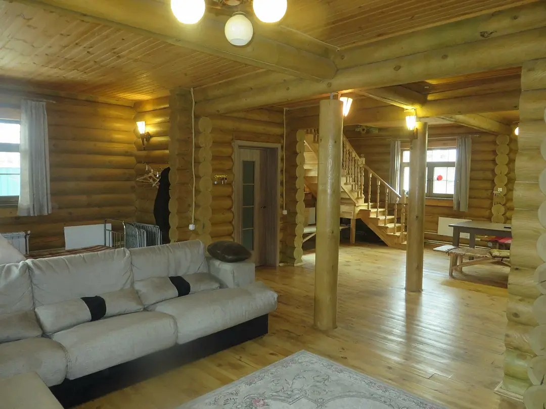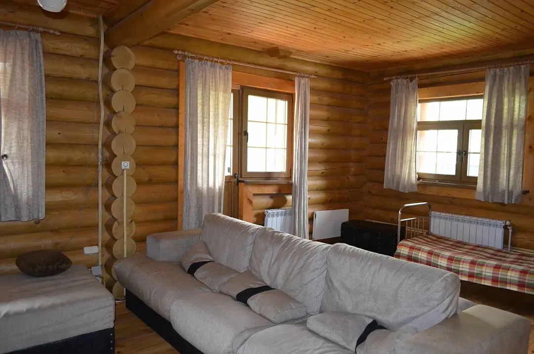 На первом этаже кухня, гостиная и санузел. В гостиной 2 односпальных дивана. На втором этаже в спальных зонах (отдельных комнат нет) 4 двуспальных кровати и 2 односпальных дивана, санузел.