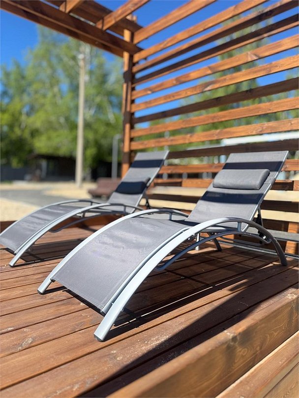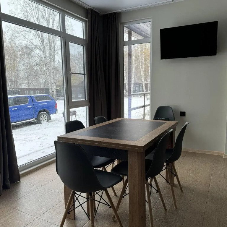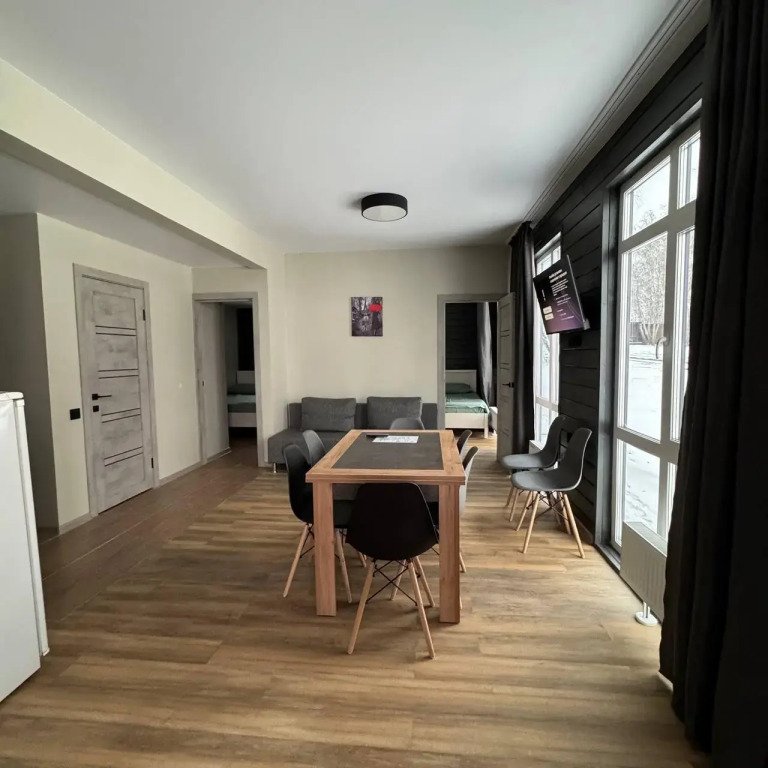 Уютный двухкомнатный дом с панорамными окнами, площадью 60 кв.м.: 2 спальные комнаты, гостиная, кухонная зона и просторная веранда с мангалом. * В первой спальне: двуспальная кровать, прикроватная тумба и вместительный шкаф; * Во второй спальне: двуспальная кровать, прикроватная тумба; * В гостиной расположена зона отдыха: диван ️ (может служить дополнительным спальным местом до 2 гостей), обеденная и кухонные зоны. * Полностью оборудованная кухня: холодильник, микроволновка, варочная панель, необходимая посуда, а также стол и стулья для комфортного приема пищи. * Санузел оборудован душем, феном, укомплектован жидким мылом туалетной бумагой и освежителем воздуха, комплектом полотенец по числу гостей. Для дополнительного удобства предоставляются: сушка для белья, принадлежности для мытья посуды. В доме, для комфорта в любое время года, кондиционер и теплые полы. Для вашего досуга — Smart TV с доступом к онлайн-контенту. *Дополнительное спальное место не предусмотреноУслуги и удобства
