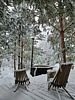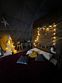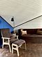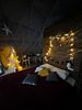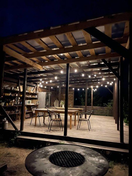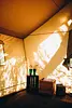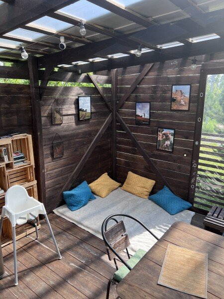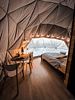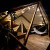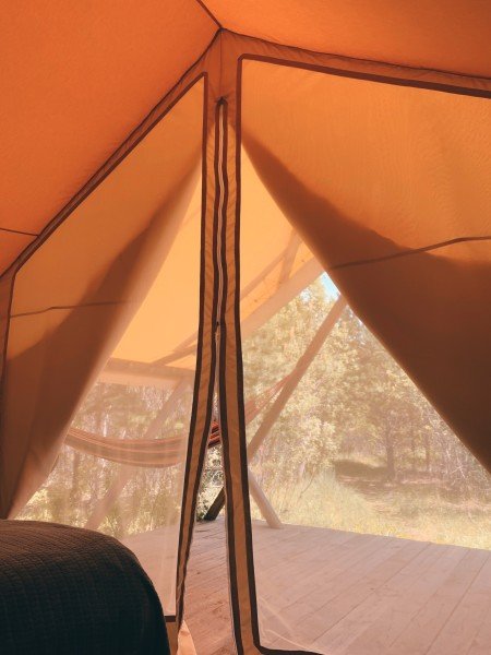 На террасе есть мини-кухня с чайником и умывальником с теплой водой, посуда, сумка-холодильник, гамак, внутри шатра простыни с подогревом на случай холода, вентилятор на случай жары, полотенца, постельное, вешалка для одежды, светильники.