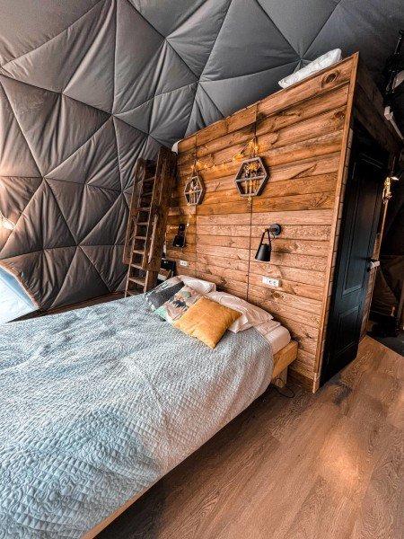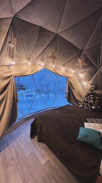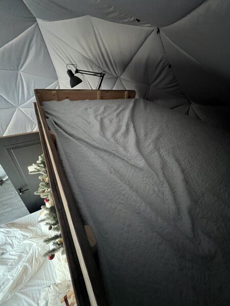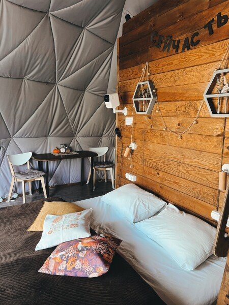 Уютный купол с панорамным окном. Идеален для пар, но можно размесить до 4х человек, включая детей. Внутри есть две двуспальные кровати 160х200 - на первом уровне и на антресоли.