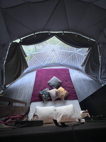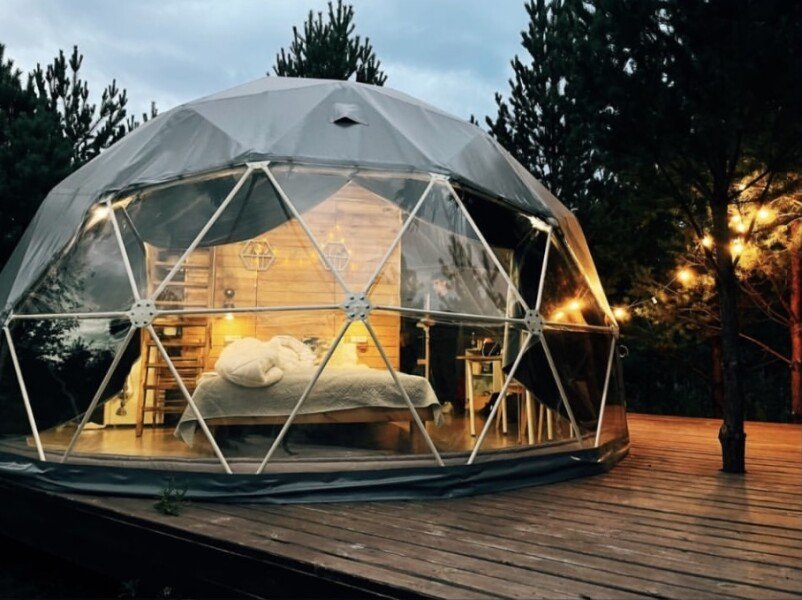 В глэмпинг можно приехать с воспитанными собаками (2 собаки в домик максимум, в купол 2 собаки мелких пород максимум).