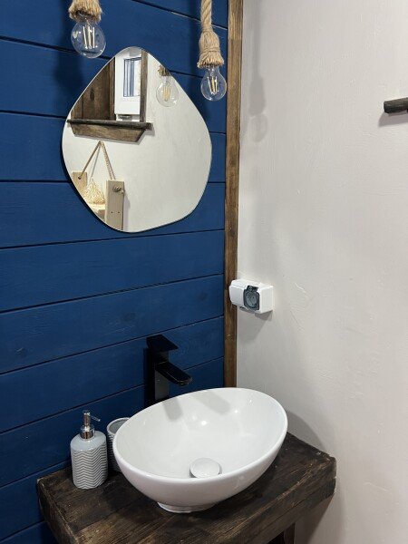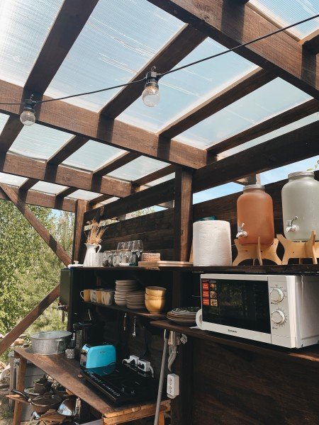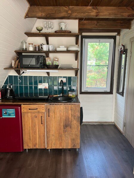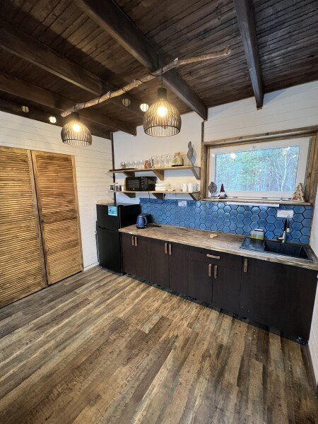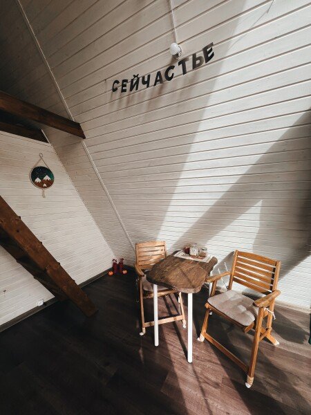 Полноценная кухня на летней веранде, где есть индукционная плита, термопот, большой холодильник, микроволновка, тостер, вся посуда и мангальная зона. Веранда закрыта мягким окнами - в ветреную или дождливую погоду там комфортно находиться. Гостям доступно бронирование бани и горячей купели за дополнительную плату.