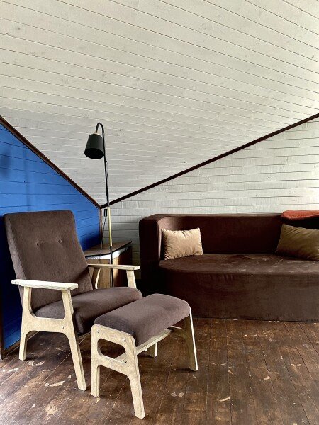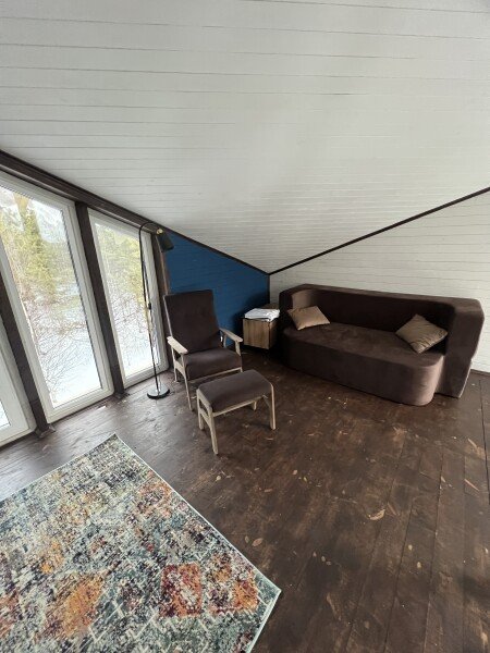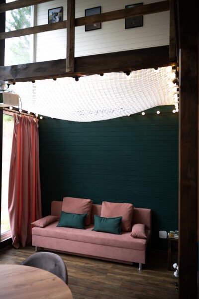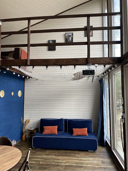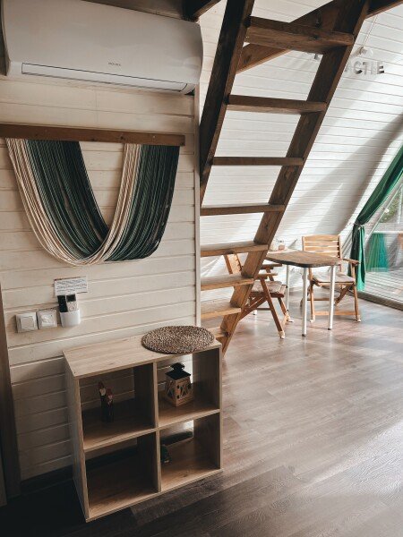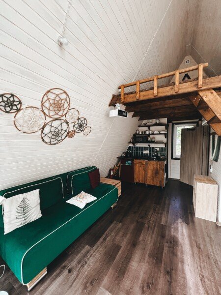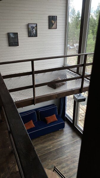 Уютный афрейм с панорамным окном. Можно комфортно размесить до 4х человек, включая детей. Внутри есть двуспальная кровать - на втором уровне и раскладной диван на первом.