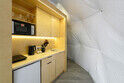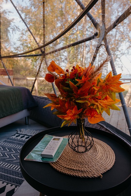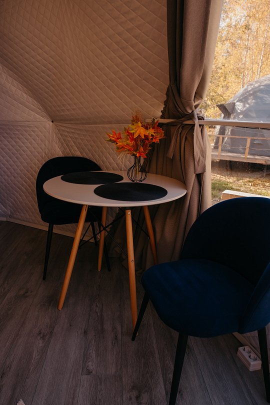 При создании интерьера вдохновлялись драгоценными камнями, изнутри открывается панорамный вид на озеро и закат. Сферы прекрасно отапливаются системой теплых полов, поэтому готовы принимать гостей круглый год! Внутри есть туалет и душевая кабина, для каждого гостя предоставляется комплект полотенец и уютный халат. Кухни оборудованы всем необходимым для приготовления и сервировки.