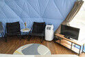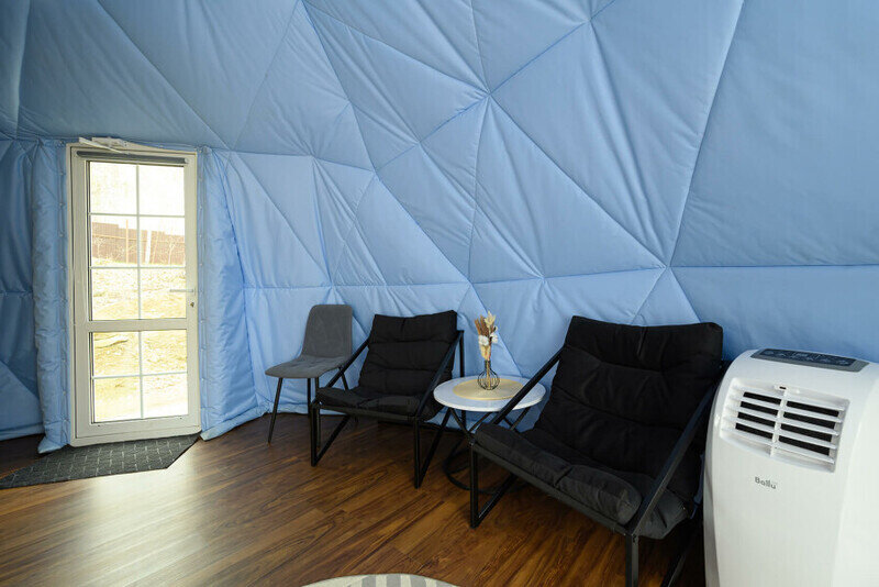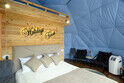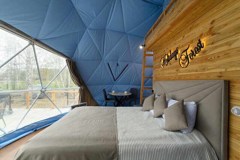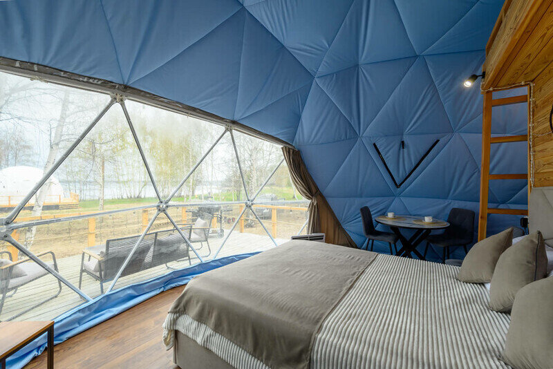 Используя оттенки яркого синего и глубокого индиго, мы создали интерьер, который олицетворяет изысканность и пленительную красоту. Прозрачные, панорамные окна геокупола и мягкий, глубокий интерьер создают впечатляющую атмосферу гармонии с природой и эффектную игру света и теней.