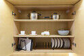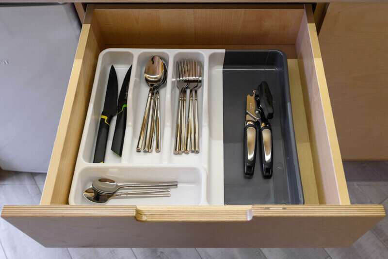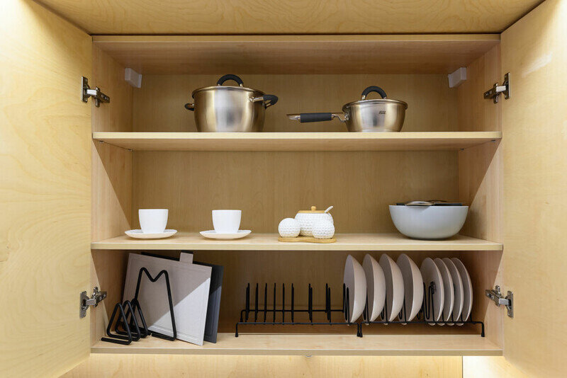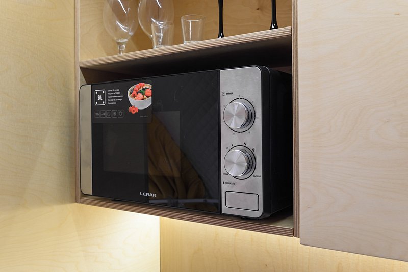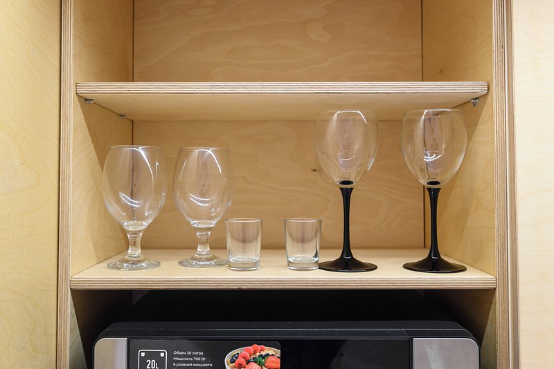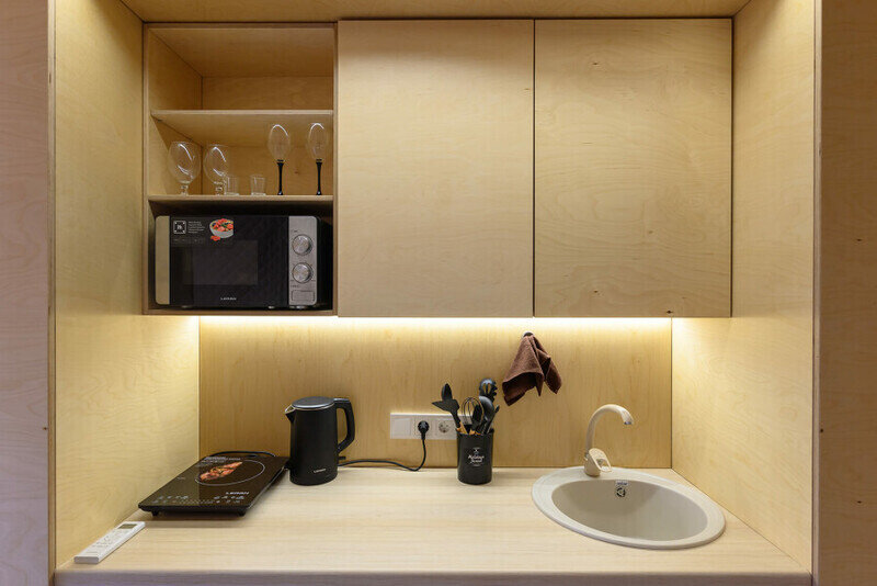- зона мини-кухни с холодильником, микроволновкой, плитой, чайником и всей необходимой посудой для приготовления