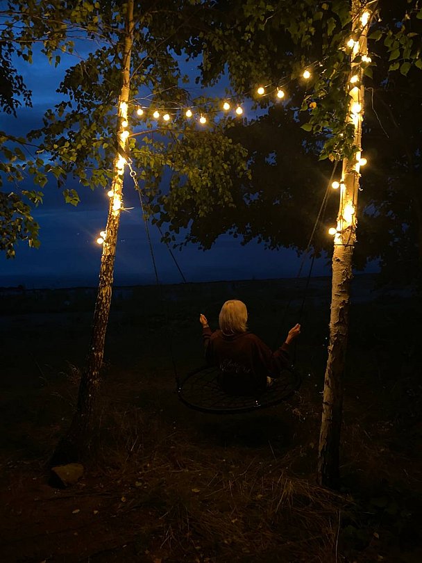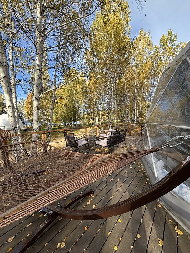 Сфера с панорамным видом на озеро Увильды и уникальный дизайн интерьера создают чувство уединения и внутреннего свечения, придают ощущение теплой элегантности и неповторимой красоты. Мягкое освещение и оттенки создают ощущение умиротворения и комфорта, поражая своей утонченностью. На собственной террасе гамак, гриль мангал. Комфортное размещение для 4-х гостей.