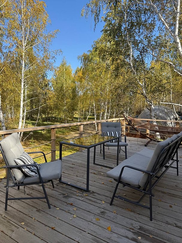- на индивидуальной террасе купель( отдельная услуга), гриль мангал, гамак, стол и стулья