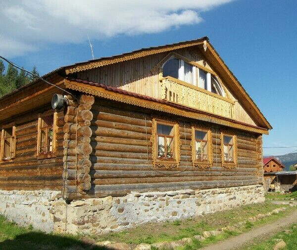 Двухэтажный бревенчатый сруб с резьбой на наличниках и фронтоне. На первом этаже расположены два теплых санузла, кают-компания, кухня, один 2-местный, один 1-местный и два 4-местных номера. На втором этаже большого дома - 4 двухместных улучшенных номера, с телевизором и холодильником.
