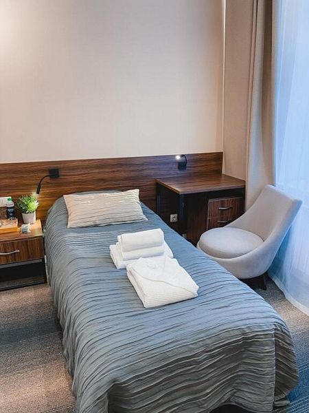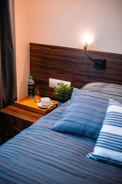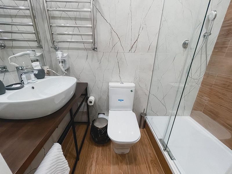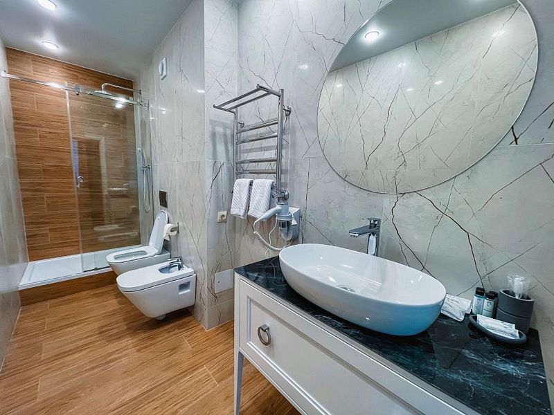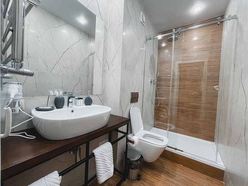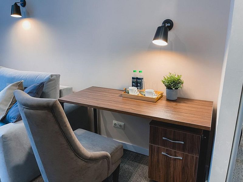 В номере есть ванная комната с удобной душевой кабиной, шкаф для одежды, мини-холодильник, кондиционер, сейф, телевизор с плоским экраном. Комфортная кровать с ортопедическим матрасом подарит полноценный отдых. В стоимость номера входит завтрак, парковка, бесплатное пользование Wi-Fi, посещение тренажерного зала, услуги местной (городской) телефонной связи, чайные и банные принадлежности.