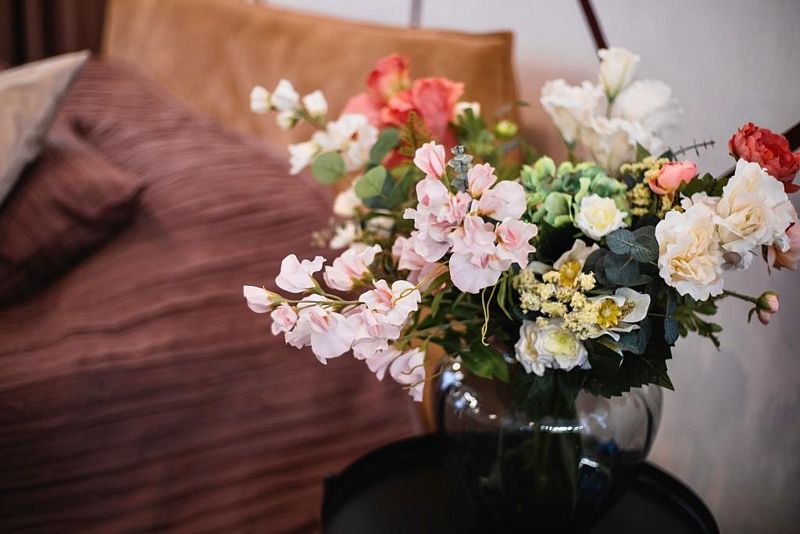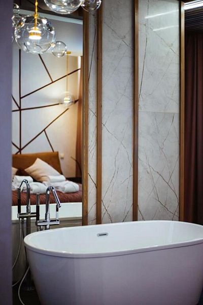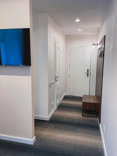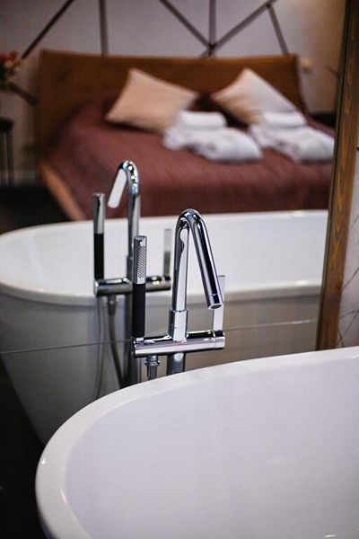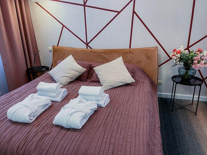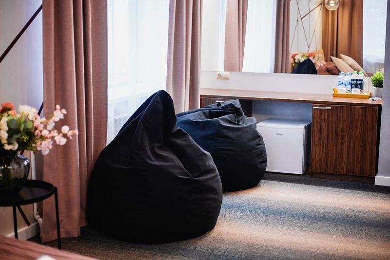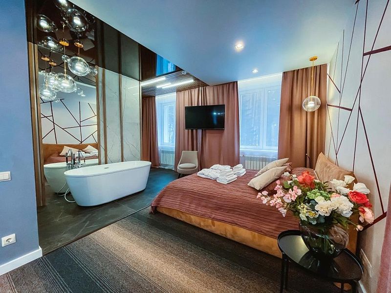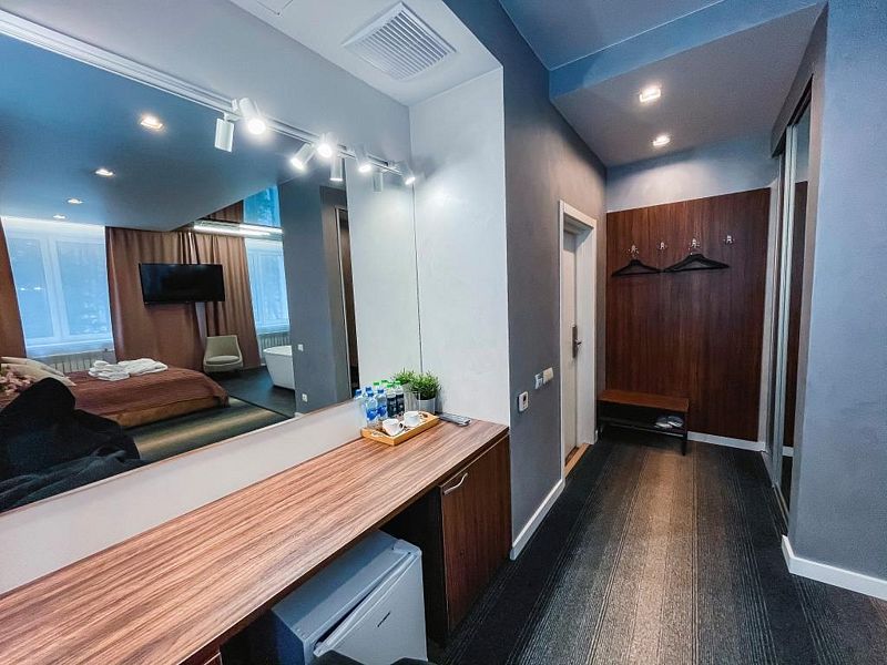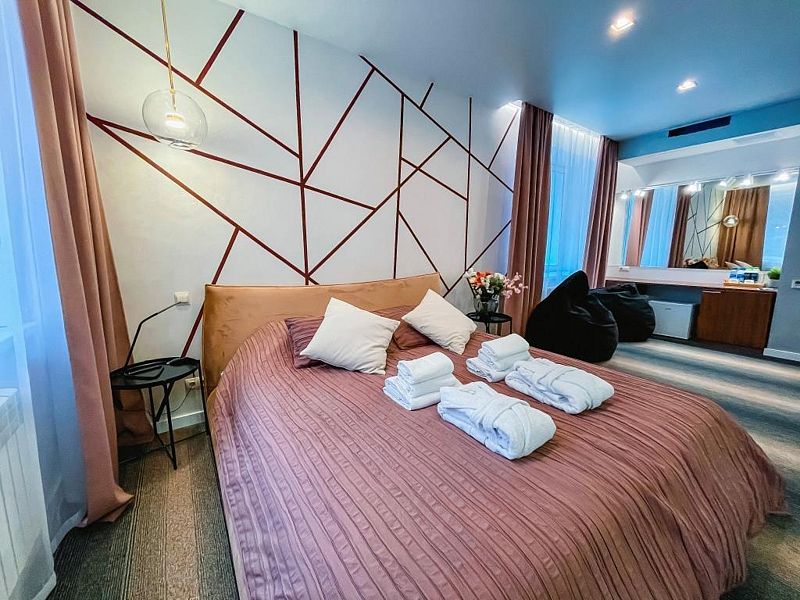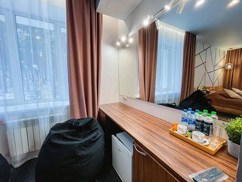 Стильный интерьер выполнен в приглушенных розовых тонах. Номер оснащен ванной комнатой с душевым шкафом, , шкафом-купе для одежды, мини-холодильником, кондиционером, а также, большим плоским телевизором и дополнительной ванной в самом номере В стоимость номера входит завтрак, парковка, бесплатное пользование Wi-Fi, пользование тренажерным залом, услуги местной (городской) телефонной связи, чайные и банные принадлежности. Окна номера выходят на сосновый лес.
