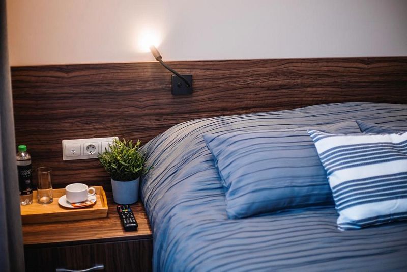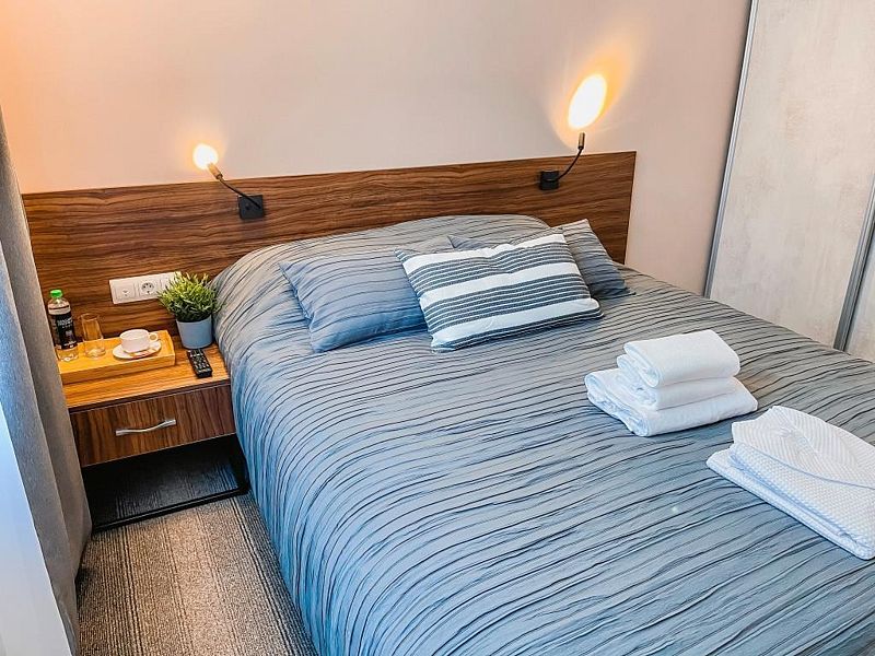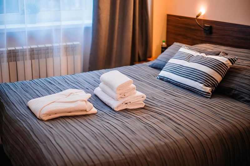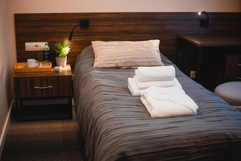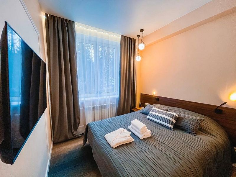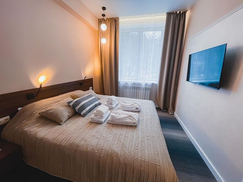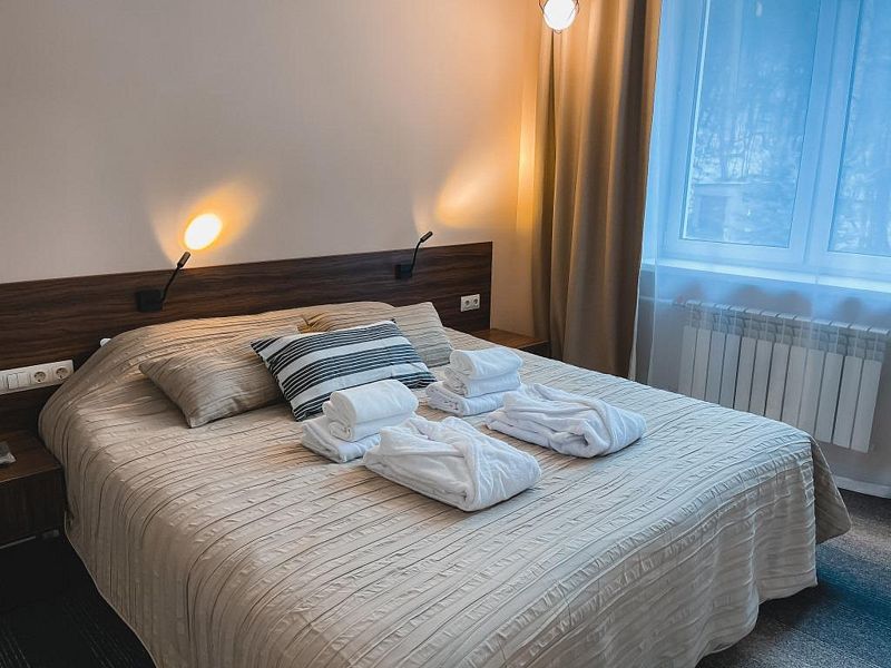 В номере есть всё для удобства гостей: ванная комната с душевой кабиной, шкаф-купе для одежды, мини-холодильник, кондиционер, сейф. В стоимость номера входит завтрак, парковка, бесплатное пользование Wi-Fi, посещение тренажерного зала, услуги местной (городской) телефонной связи, чайные и банные принадлежности. По желанию гостей можно выбрать вариант размещения с видом на лес или на озеро.