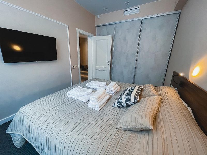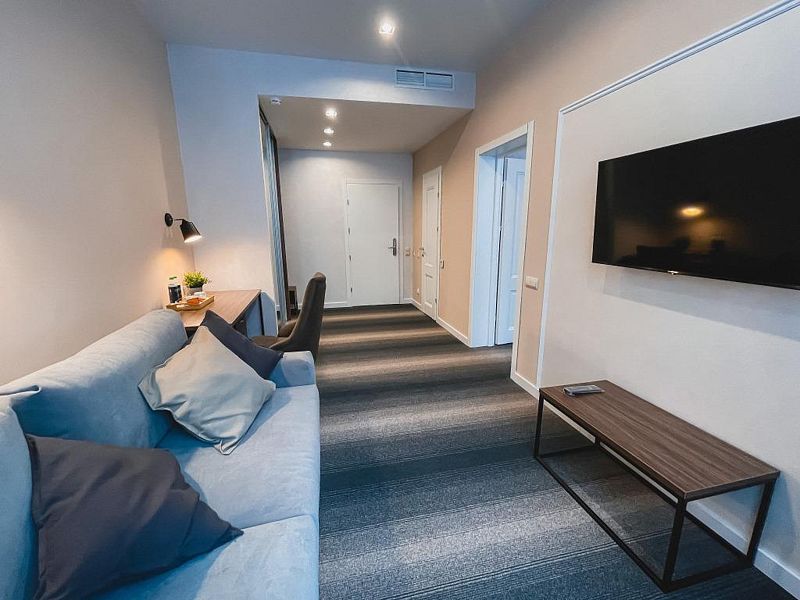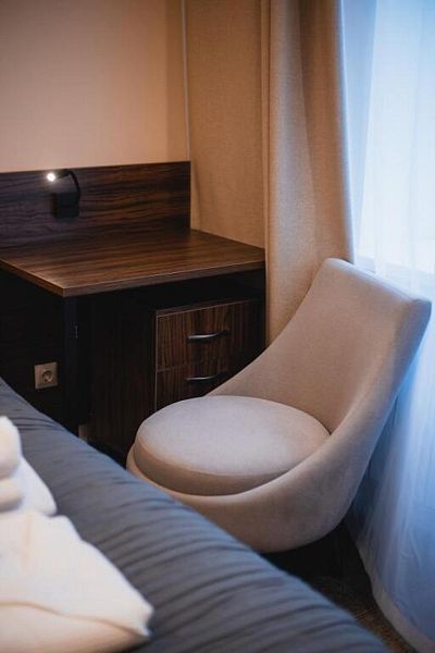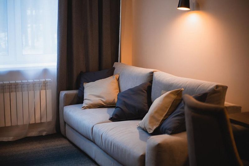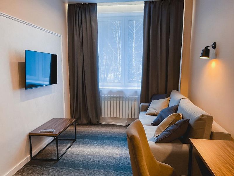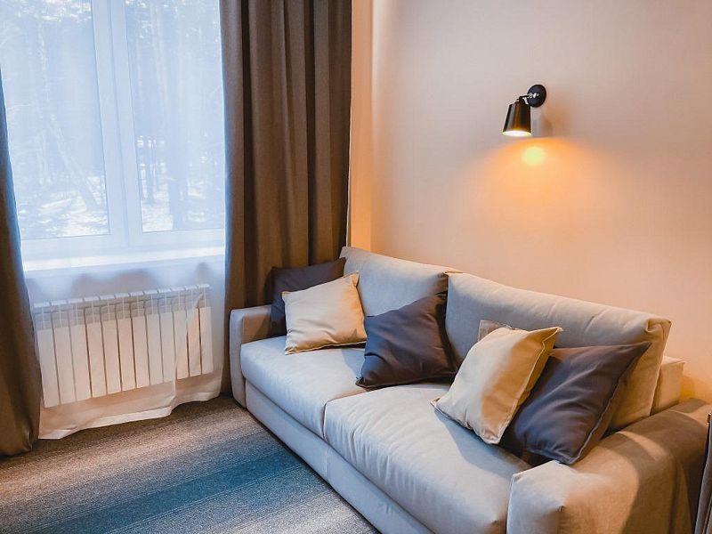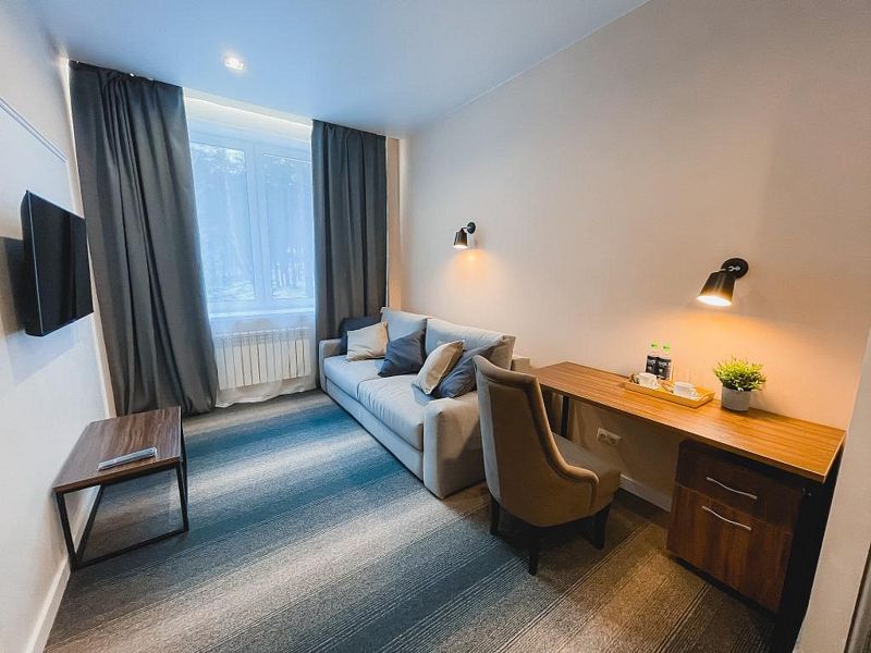 В номере имеется раскладной диван, который также является спальным местом. Широкая двуспальная кровать укомплектована ортопедическим матрасом. Она легко раздвигается, превращаясь в два самостоятельных спальных места. Номер оснащен всем необходимым для комфортного отдыха: ванной комнатой c современной душевой кабиной, шкафом для одежды, мини холодильником, кондиционером, сейфом, столом для работы. В стоимость номера входит завтрак, парковка, бесплатное пользование Wi-Fi, посещение тренажерного зала, услуги местной (городской) телефонной связи, чайные и банные принадлежности. По желанию гостей можно выбрать вариант размещения с видом на лес или на озеро.