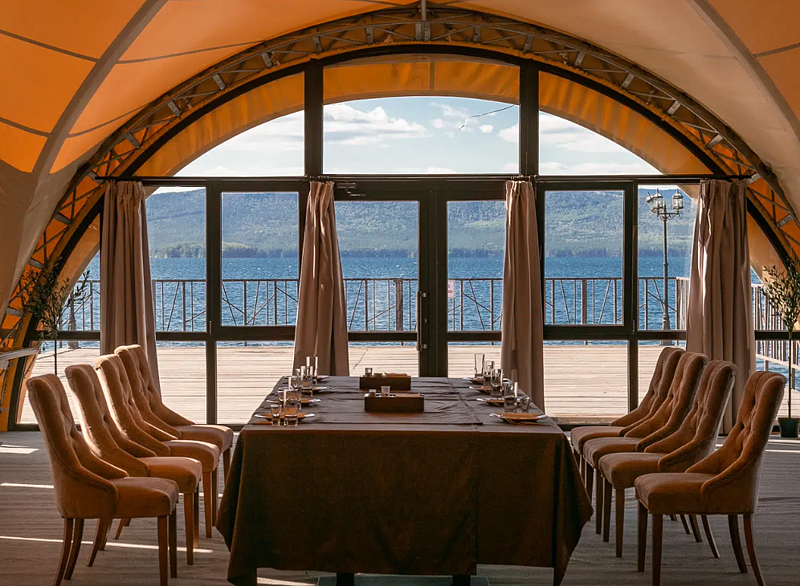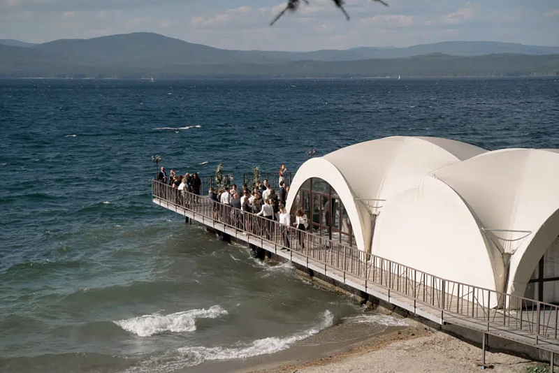 Тёплый шатёр на берегу Тургояка вместимостью до 60 человек, вместительной площадкой для уличной регистрации или мероприятия под открытым небом и местом для фотозоны. Изумительный вид на Уральское море, живописная фотозона, банкетное меню от ресторана изысканной кухни. Качественный сервис и обслуживание праздника.