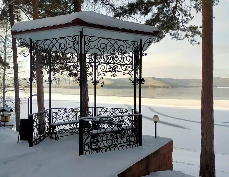 Сухая парная на берегу оз. Тургояк. Здесь есть уютная зона отдыха с большим столом и стульями, где так приятно выпить чаю после сеанса парения. Близость озера радует гостей возможностью окунуться в самом чистом озере без отрыва от парения.