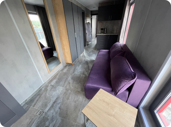 - Гостиная с двуспальным раскладным диванов и мини-кухней для приготовления пищи;