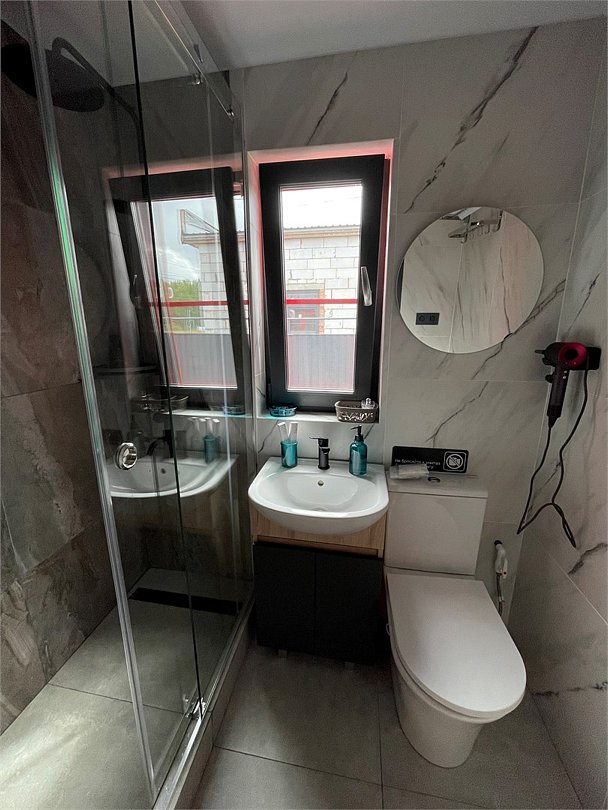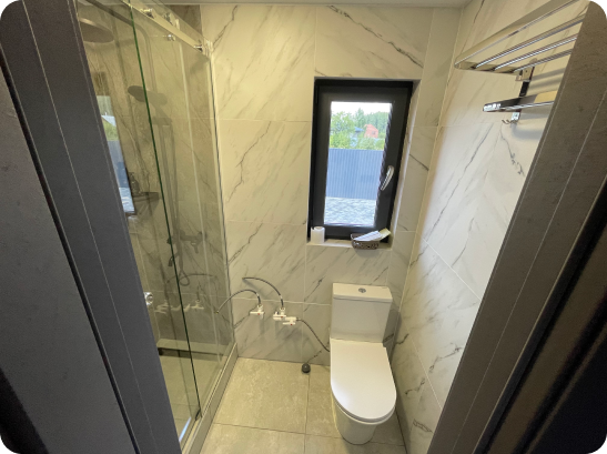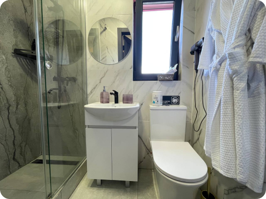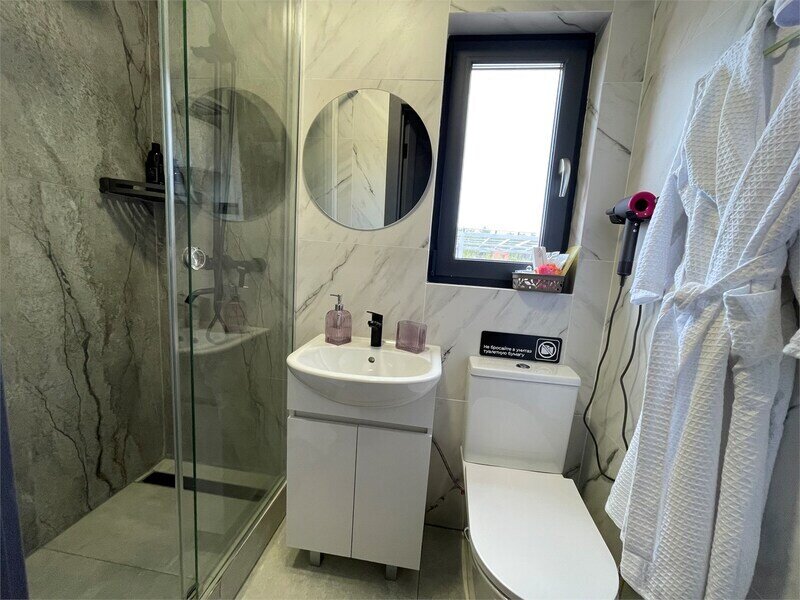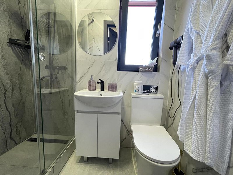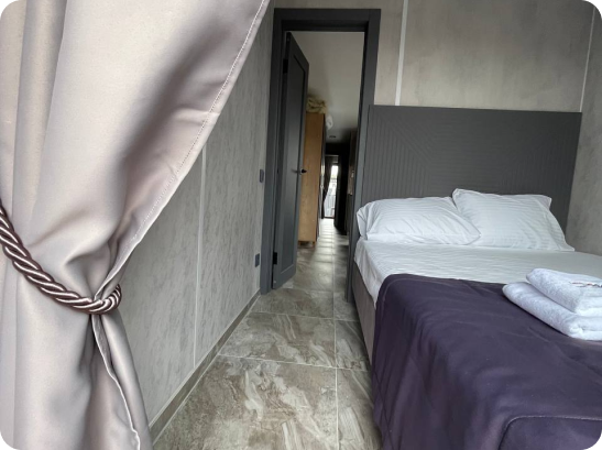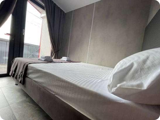 Однокомнатный номер с двуспальной кроватью — отличный вариант для пары либо одного гостя. Собственная терраса, 2х — местная кровать, столовая зона, туалетная комната с душевой.