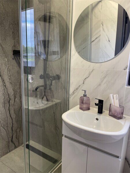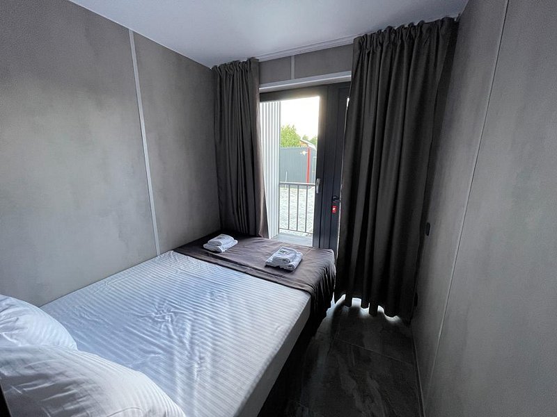 Однокомнатный номер с двуспальной кроватью — отличный вариант для пары либо одного гостя. Собственная терраса, двухместная кровать, столовая зона, туалетная комната с душевой.