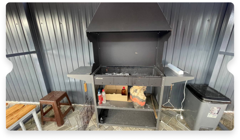 В наличии есть решётка и уголь (за дополнительную плату), использование своего инвентаря разрешается.