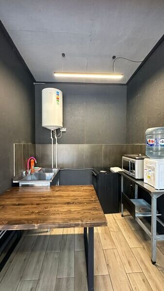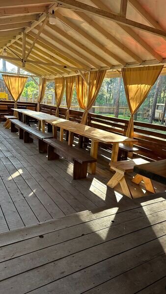 В банкетном зале теплый пол, санузел, кухонная зона (холодильник, чайник, микроволновка, разделочная доска, ножи), проектор, светомузыка, на улице мангальная зона (мангал).Решетки и шампура можно взять в аренду.