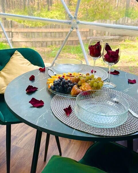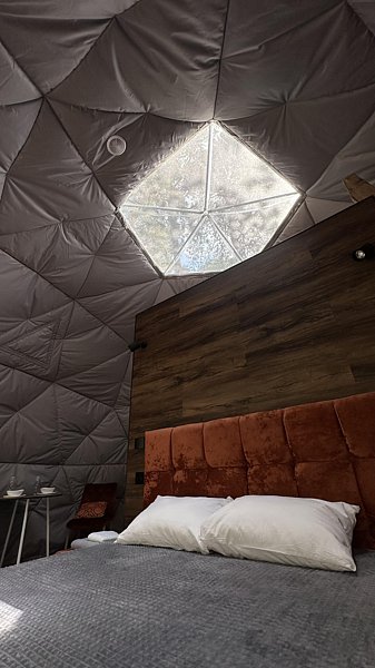 В Сфере есть все необходимое для комфортного отдыха: санузел с горячей и холодной водой, оборудованная кухня, посуда и постельное белье, полотенца и средства гигиены, теплый пол, кондиционер, мангальная зона. Сфера рассчитана до 4х гостей.