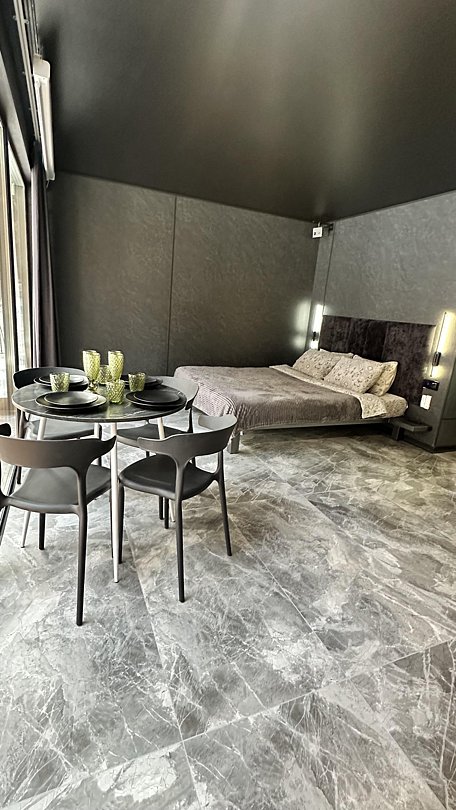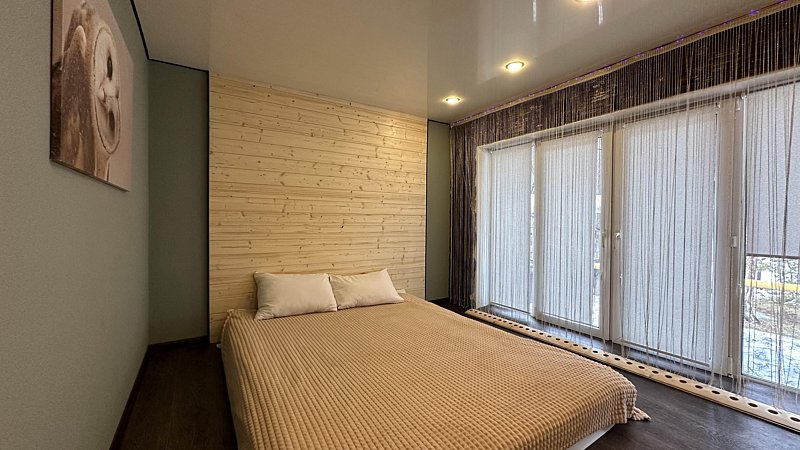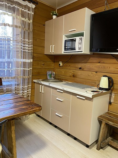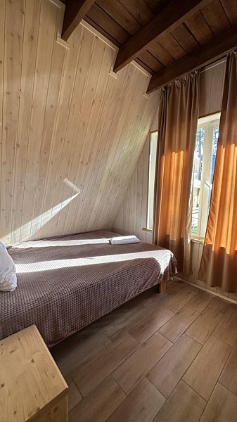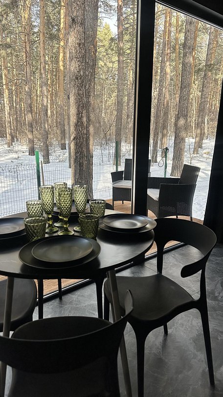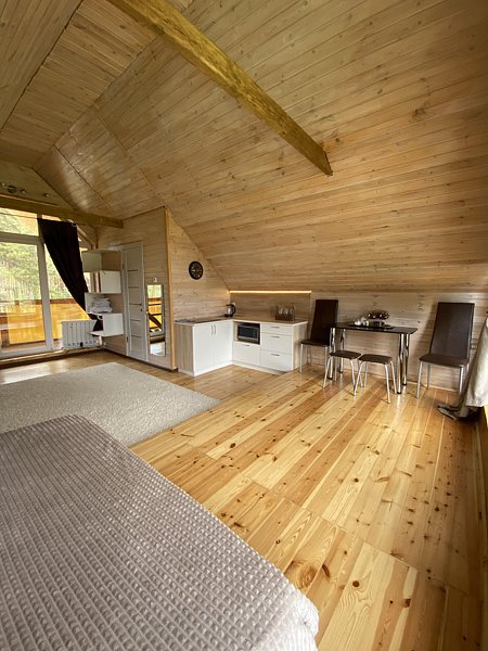 Апартамент — номер студия с прекрасным видом на сосновый бор из панорамных окон. Номер расположен на втором этаже административного коттеджа с отдельным входом. Возле номера расположена беседка с мангальной зоной, входят в стоимость проживания.