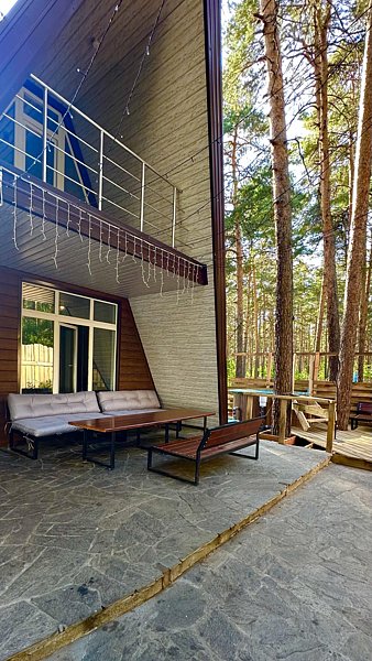 Коттедж A-frame на 12 человек выполнен в стиле шале. На первом этаже просторная гостиная и две спальни. На втором этаже две спальни с балконами. Возле дома расположена мангальная зона и подогреваемое джакузи. Джакузи входит в стоимость аренды.