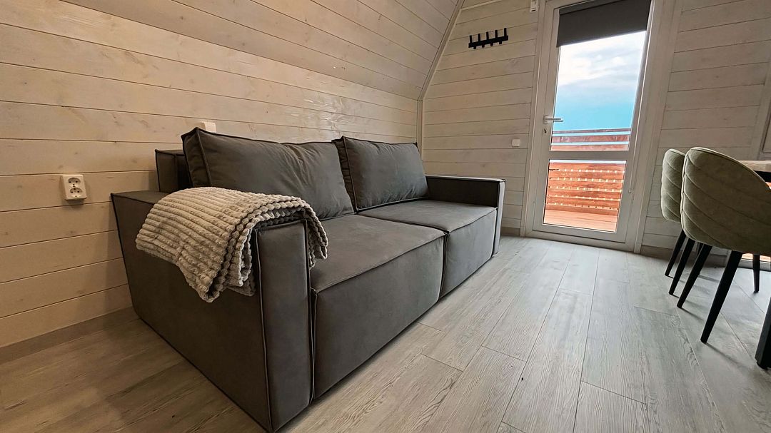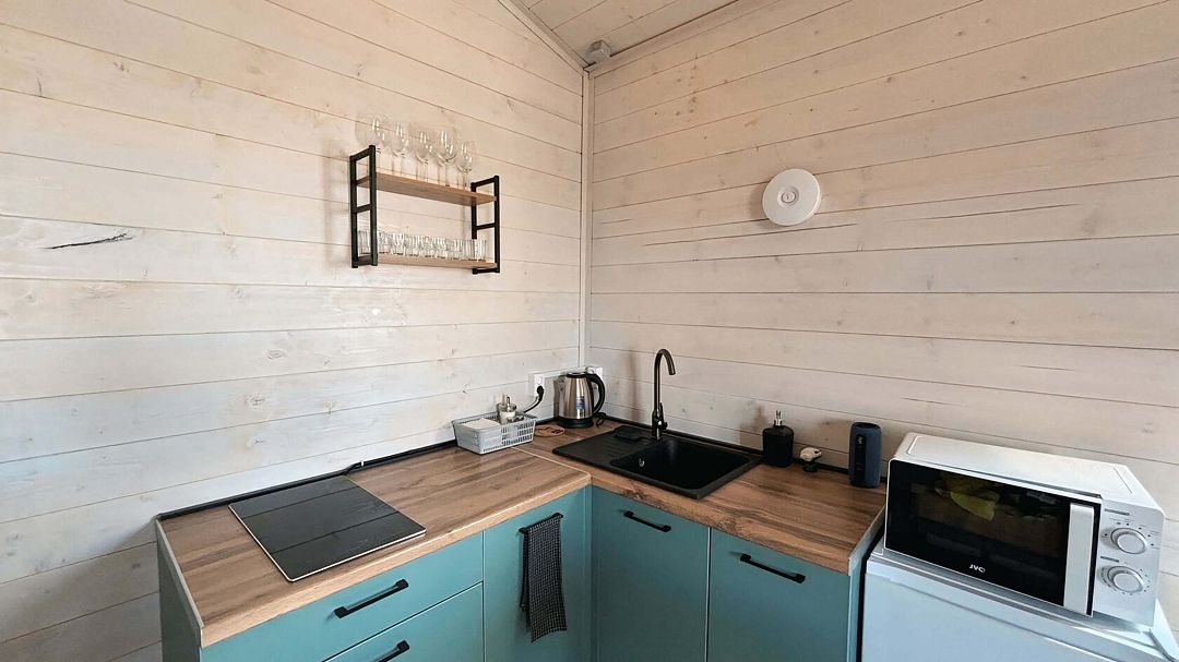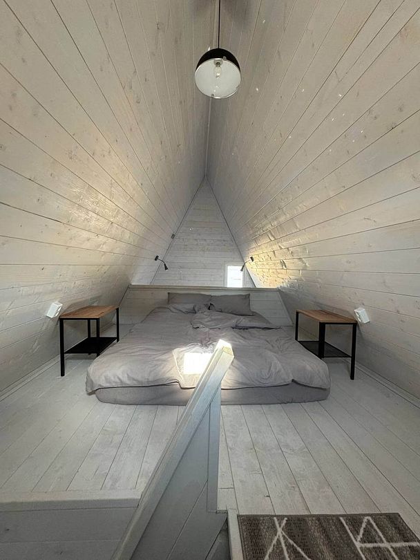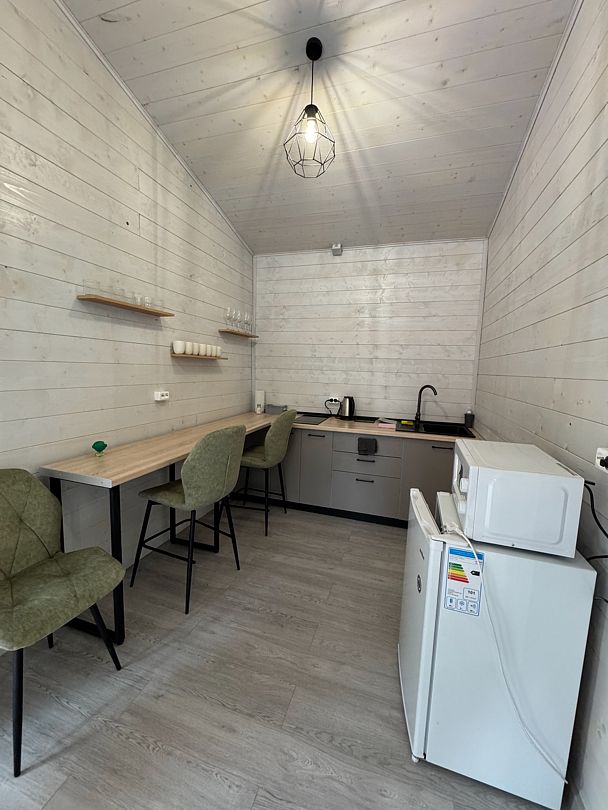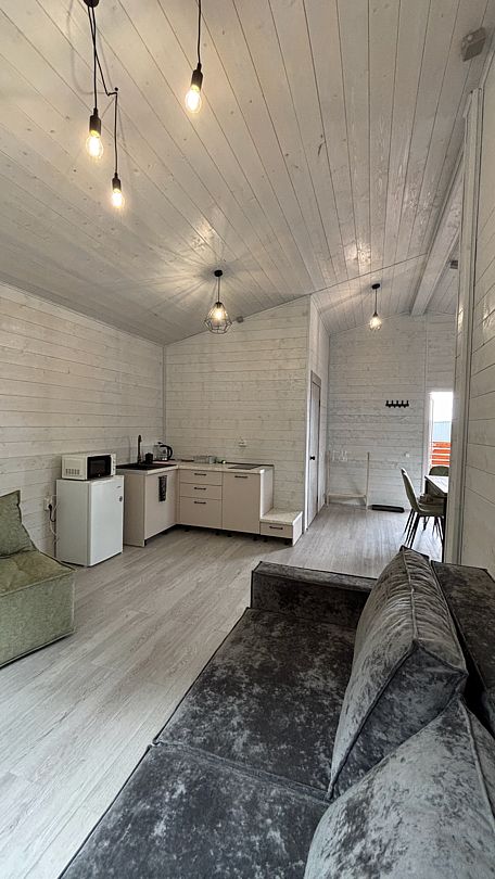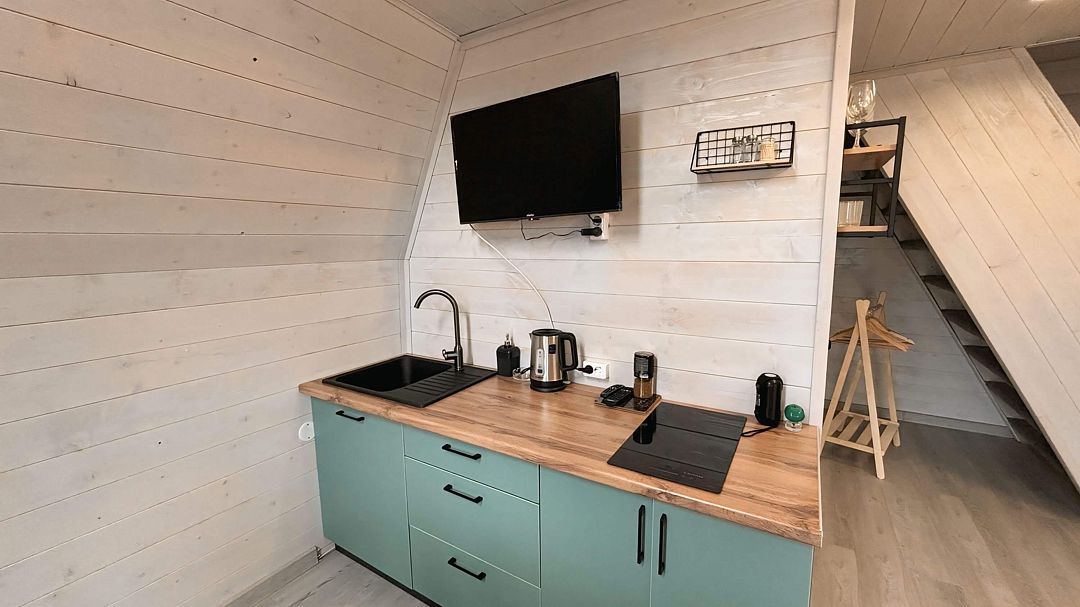 Уютный дом A-frame на берегу живописного озера Калды — идеальное место для отдыха и уединения. На первом этаже вас встретит уютный диван для двоих, который легко превращается в удобное спальное место, а также полностью оборудованная кухня с плитой, холодильником и микроволновой печью.