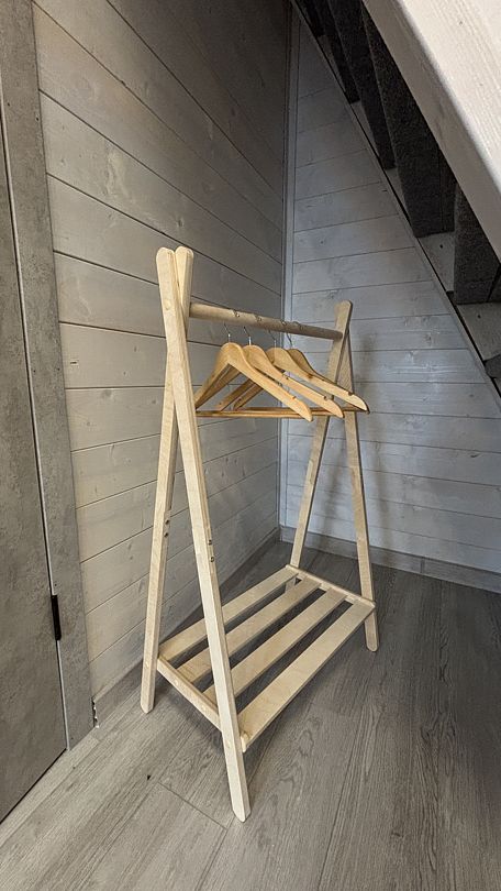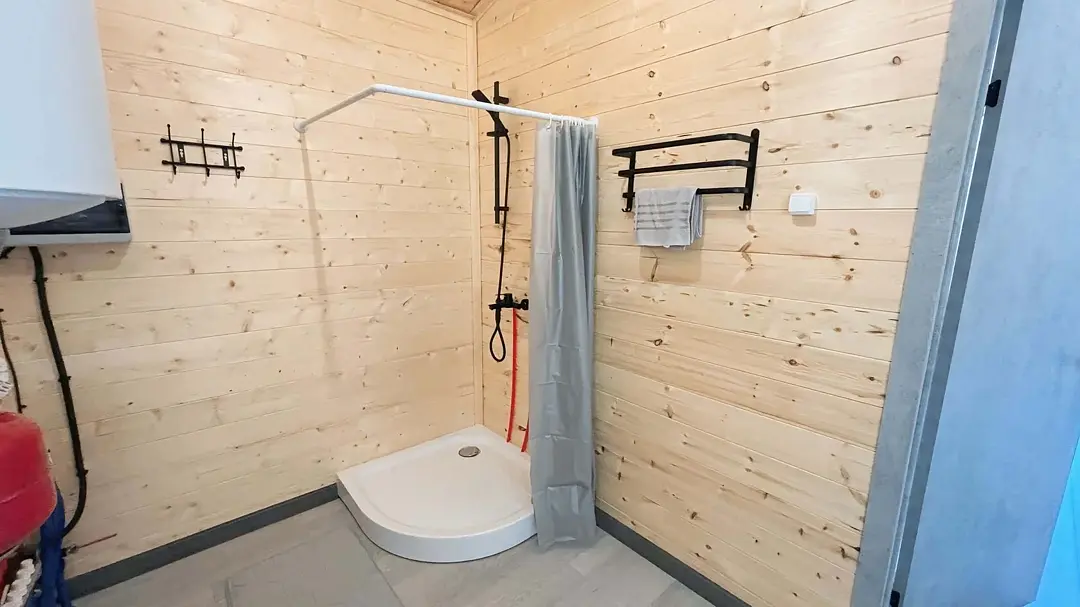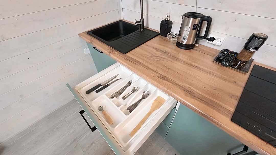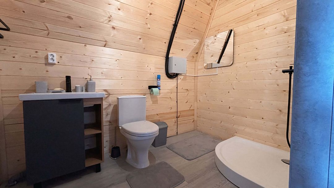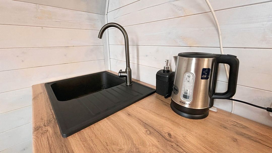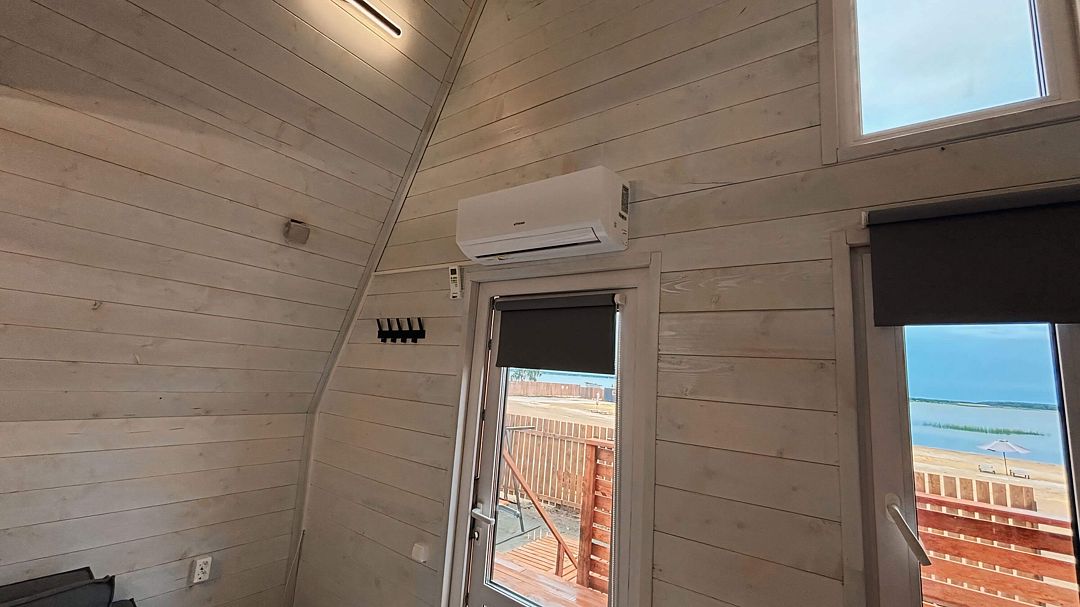 Уютный дом A-frame на берегу живописного озера Калды — идеальное место для отдыха и уединения. На первом этаже вас встретит уютный диван для двоих, который легко превращается в удобное спальное место, а также полностью оборудованная кухня с плитой, холодильником и микроволновой печью.