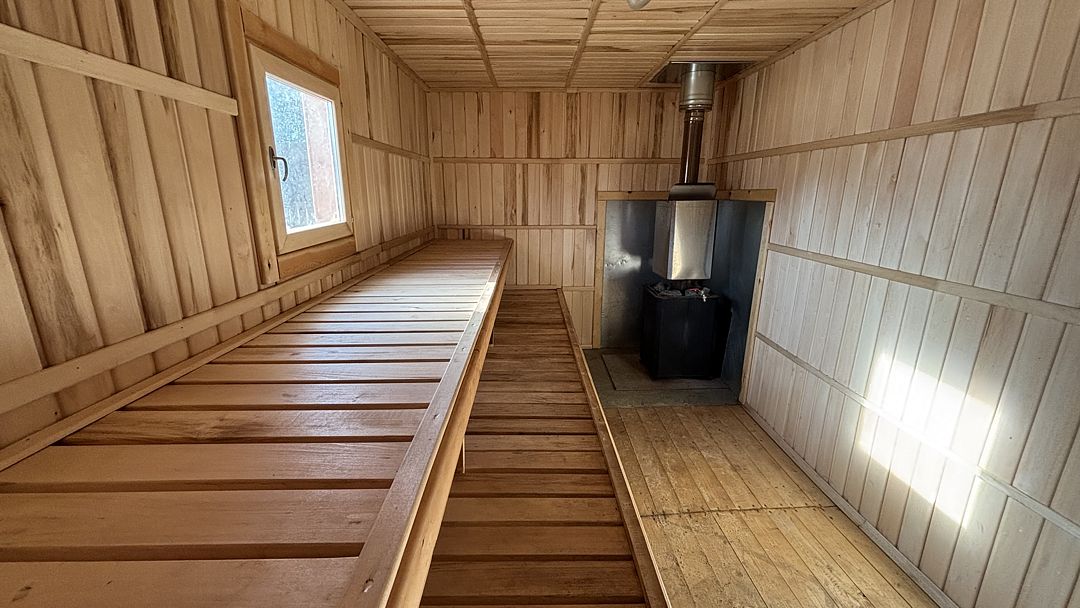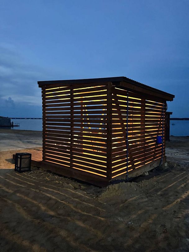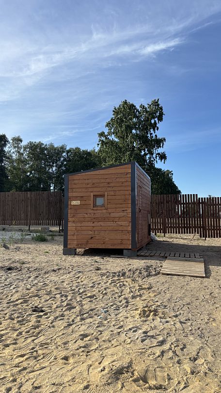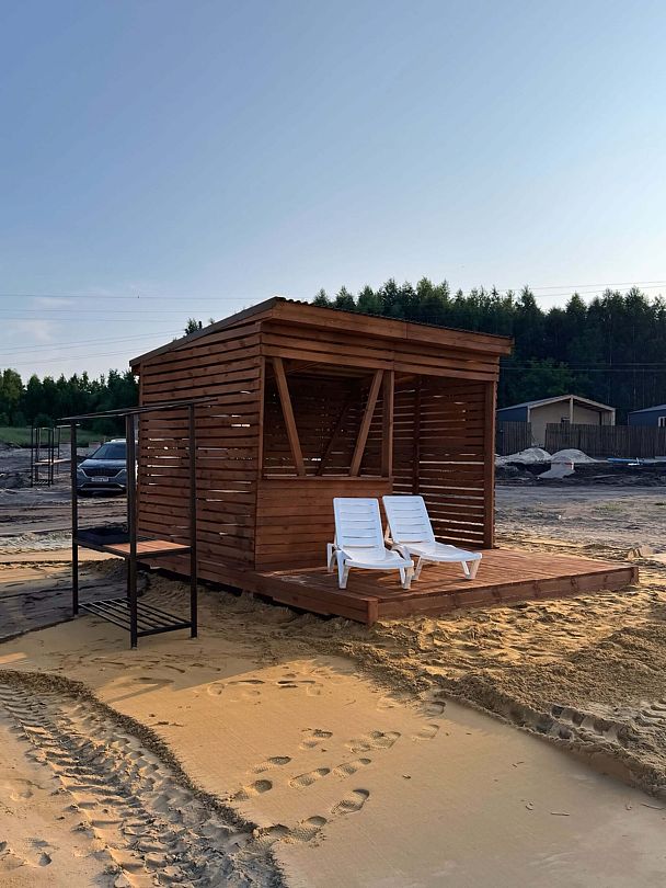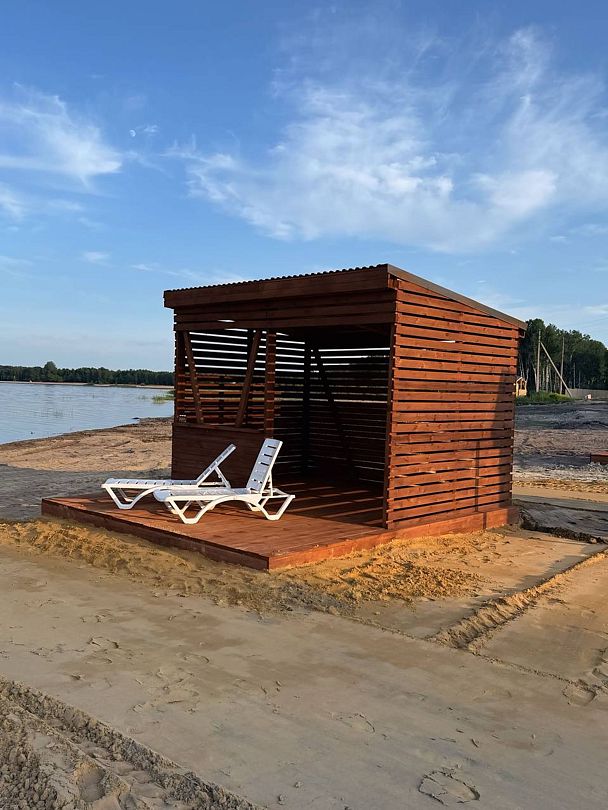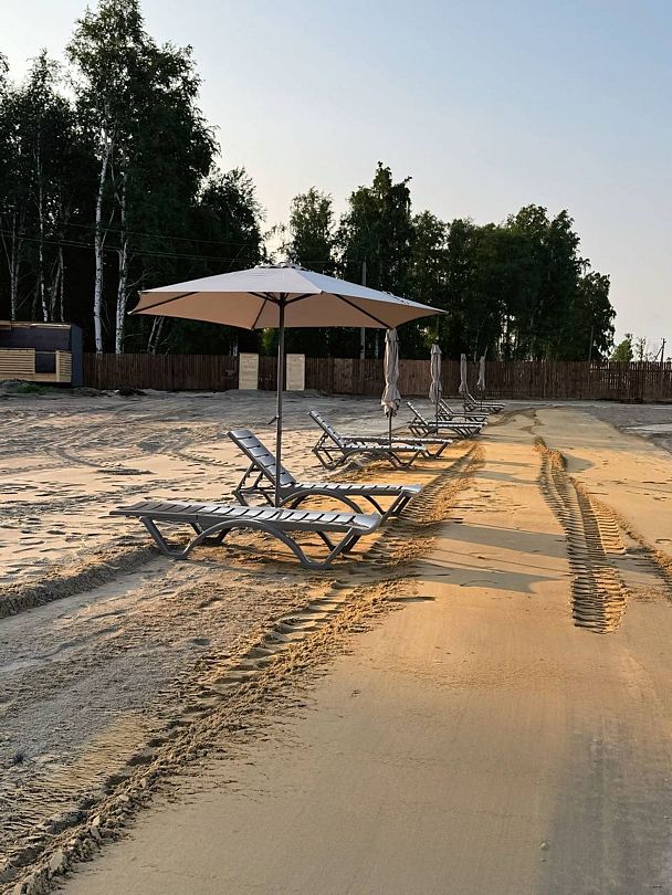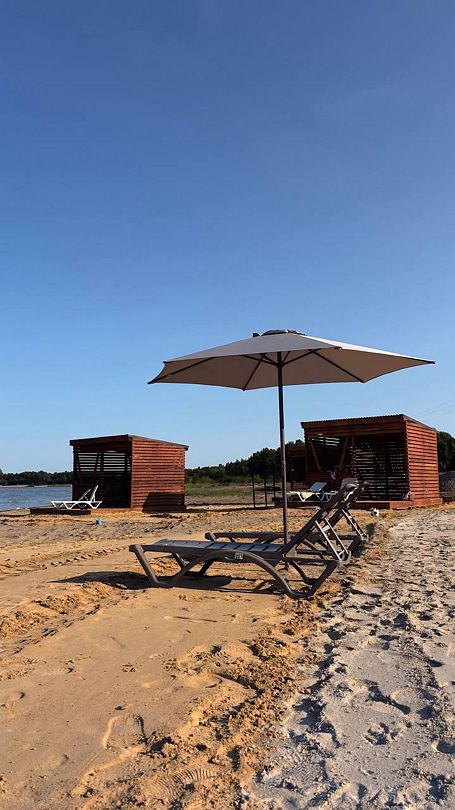 Дом находится на живописном песчаном пляже у чистого озера Калды, где для отдыхающих предусмотрены удобные лежаки и зонты, создающие атмосферу уюта и комфорта. На пляже есть общая баня, которая станет отличным местом для расслабления: здесь можно освежиться в прохладных водах озера и одновременно попариться в уютной бане.