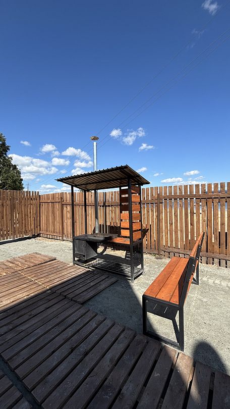 Уютный дом окружен собственной огороженной территорией, где уютно расположился мангал с местом для казана, а также беседка — идеальные места для отдыха и приятных посиделок на свежем воздухе.