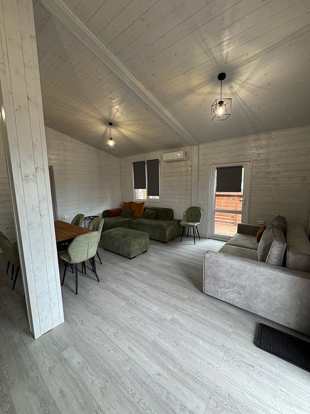 Дом Барн №5 — уютное место для комфортного отдыха до двенадцати человек. В основной комнате расположены два удобных дивана со спальным местом для двоих, в двух комнатах кровать для двоих и двухспальный диван.