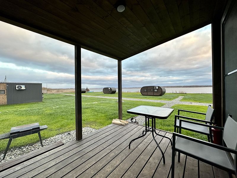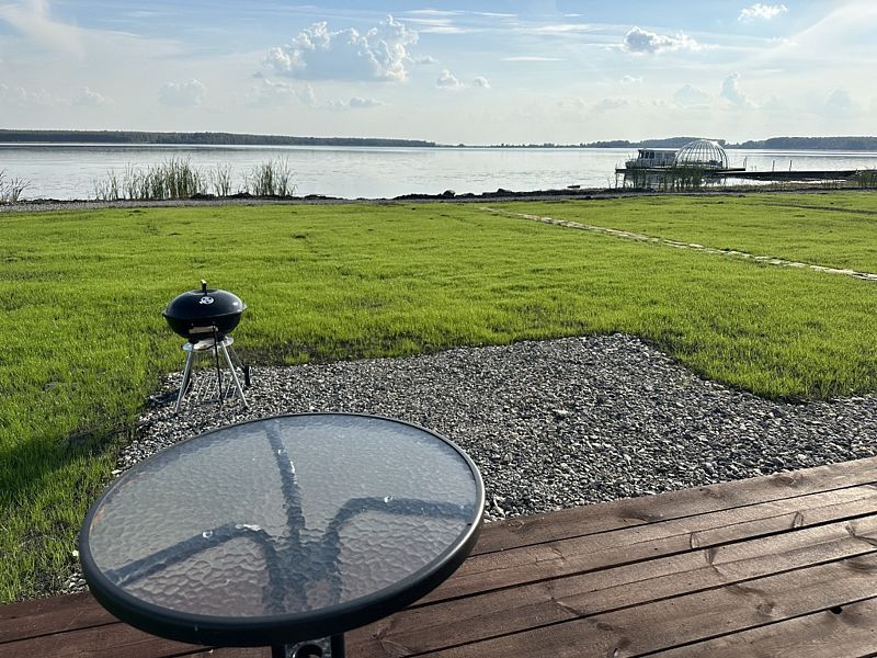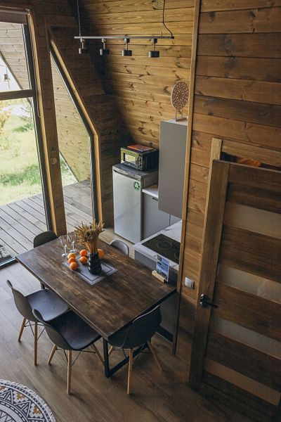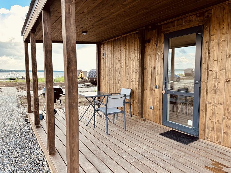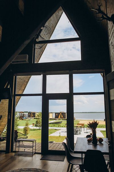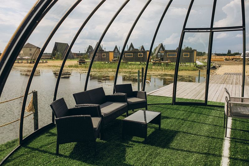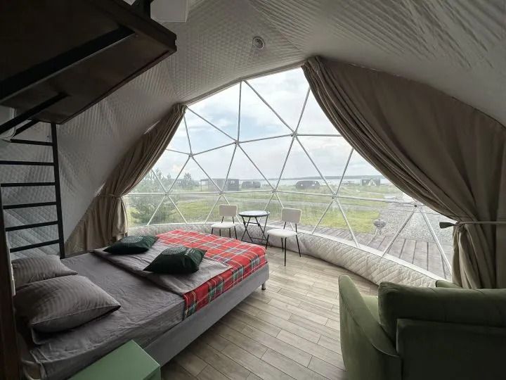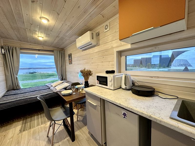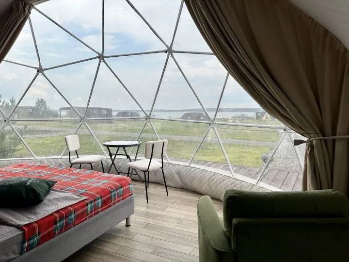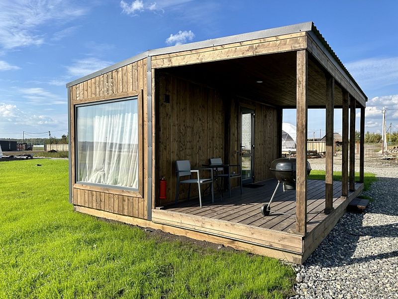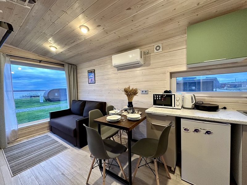 Уютный овальный домик с панорамным видом на озеро. В нем есть все необходимое для комфортного пребывания на природе.