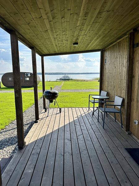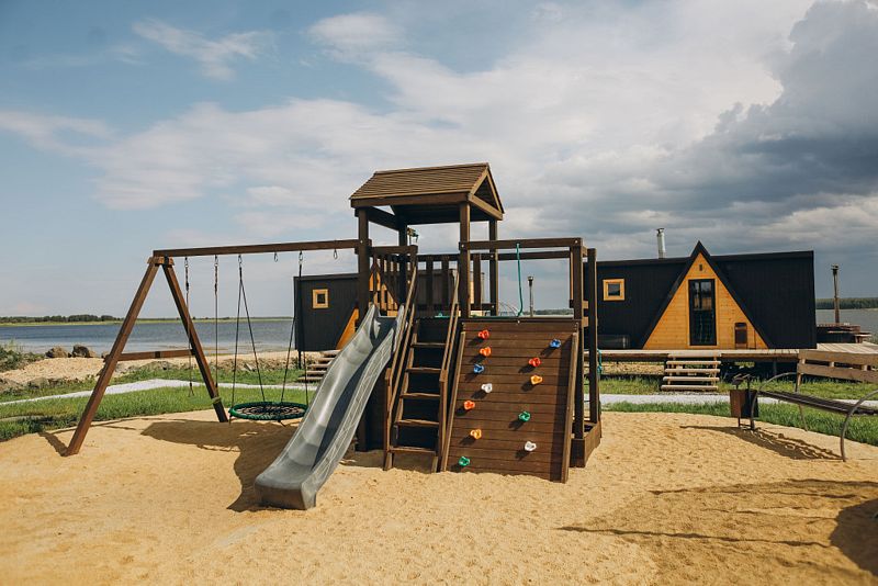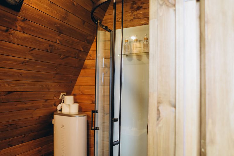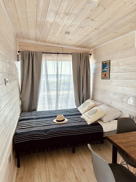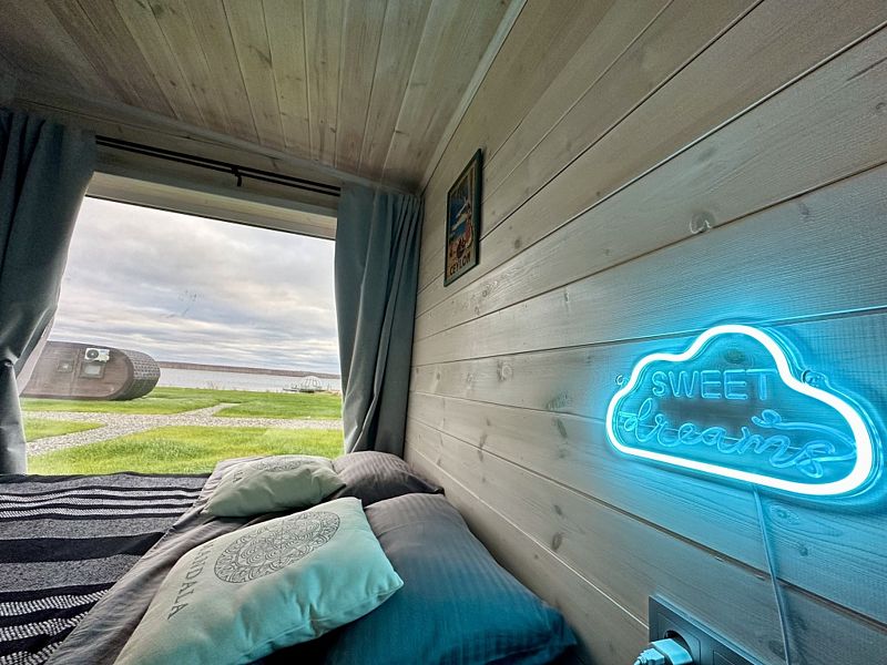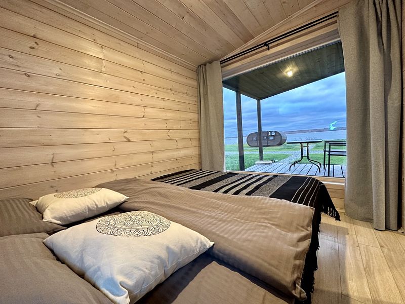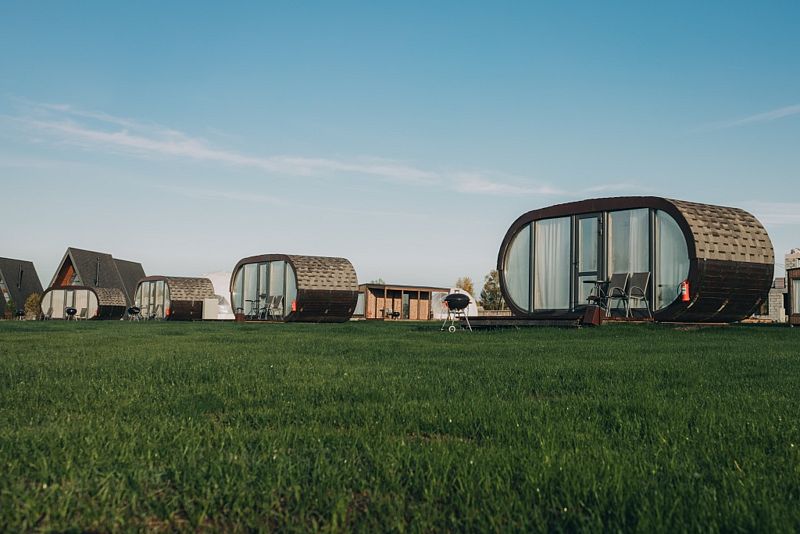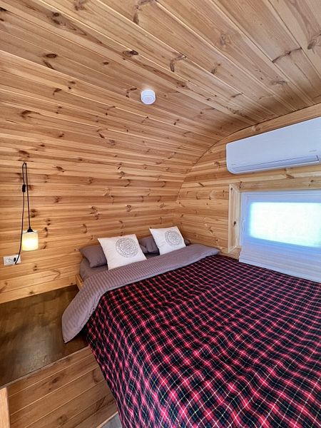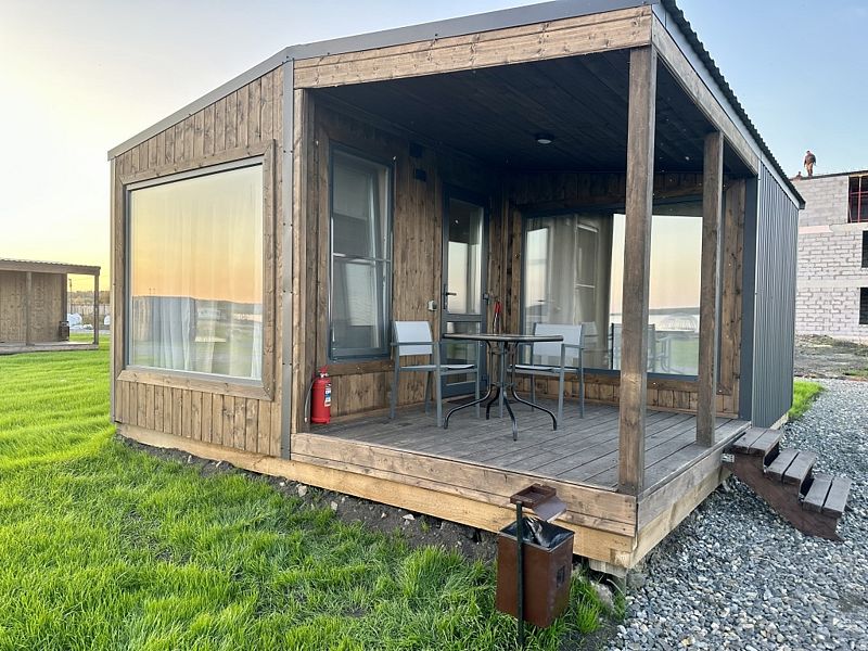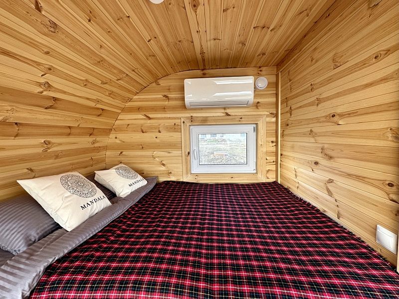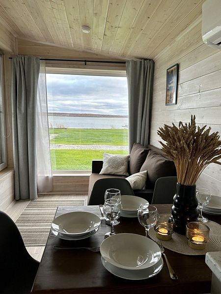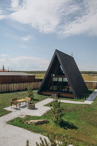 Уютный овальный домик с панорамным видом на озеро. В нем есть все необходимое для комфортного пребывания на природе.