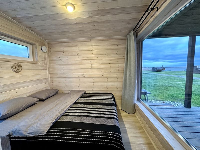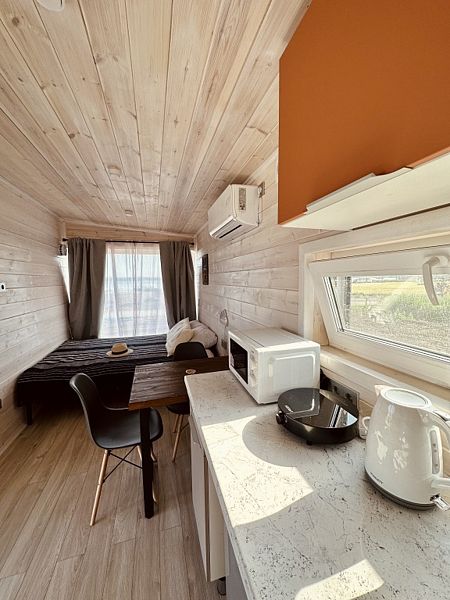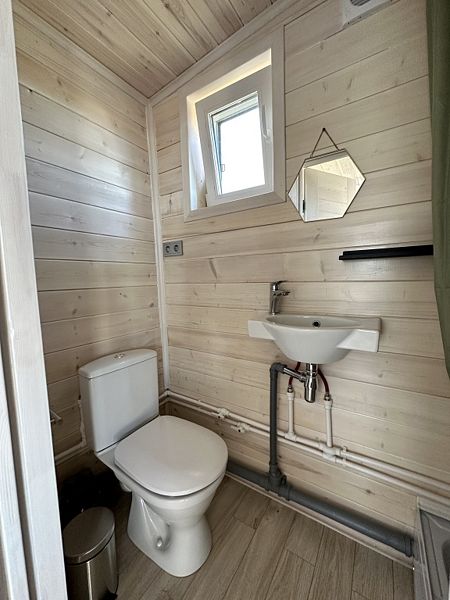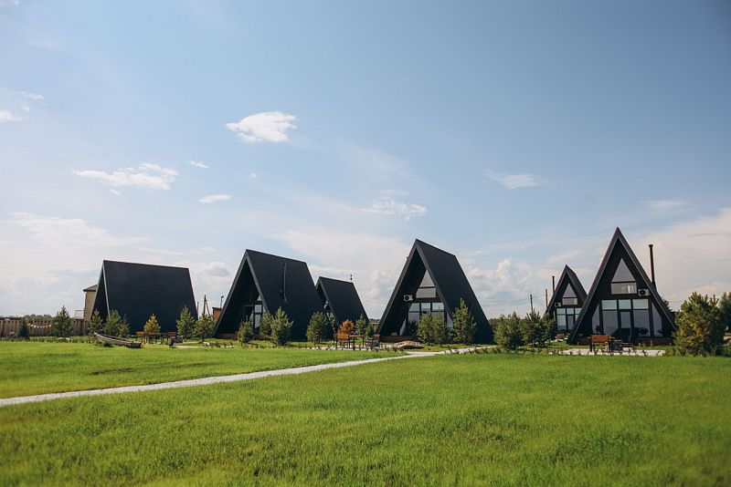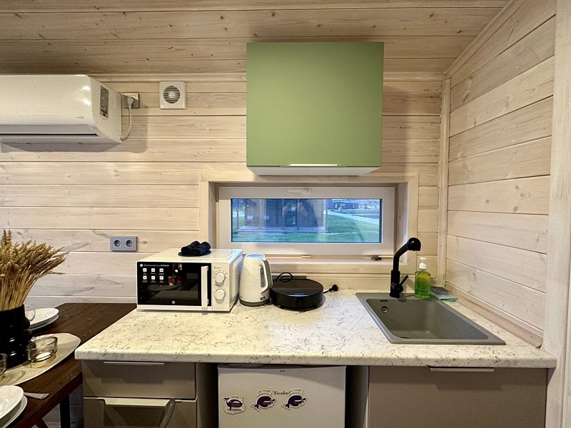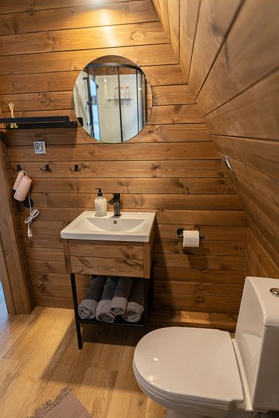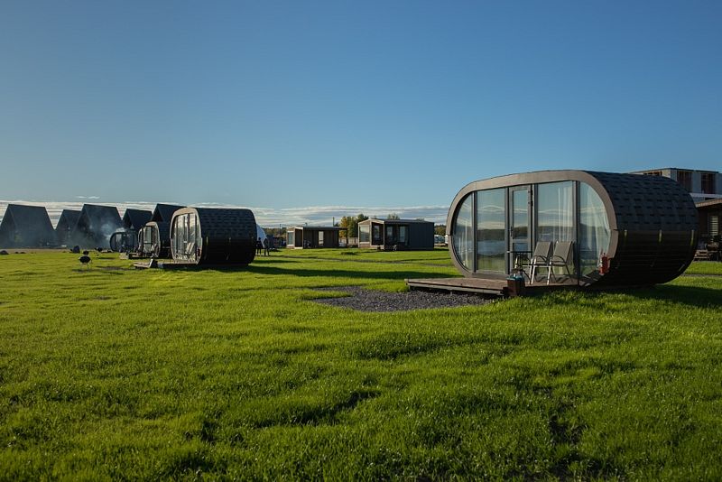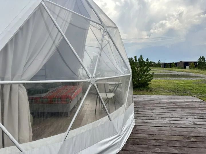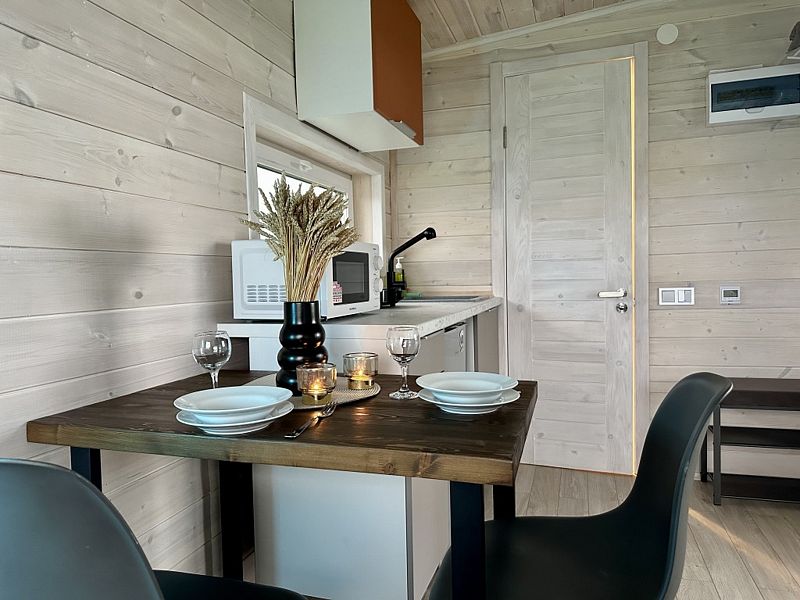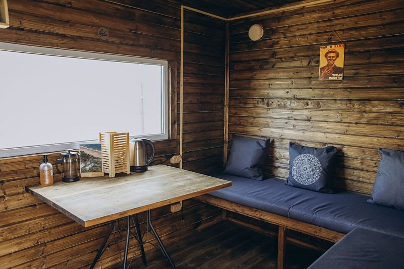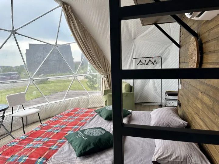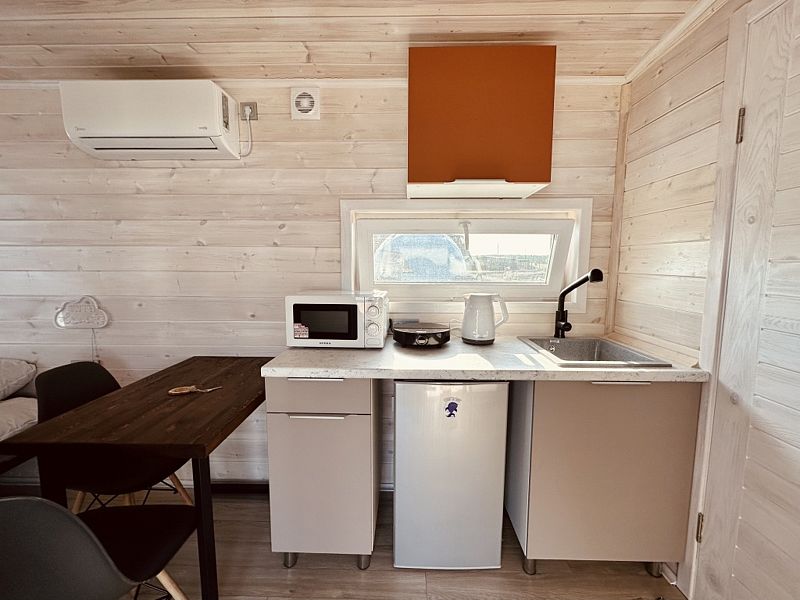 Уютный овальный домик с панорамным видом на озеро. В нем есть все необходимое для комфортного пребывания на природе.