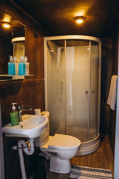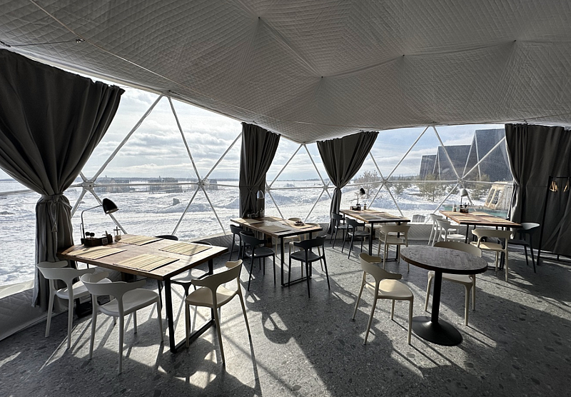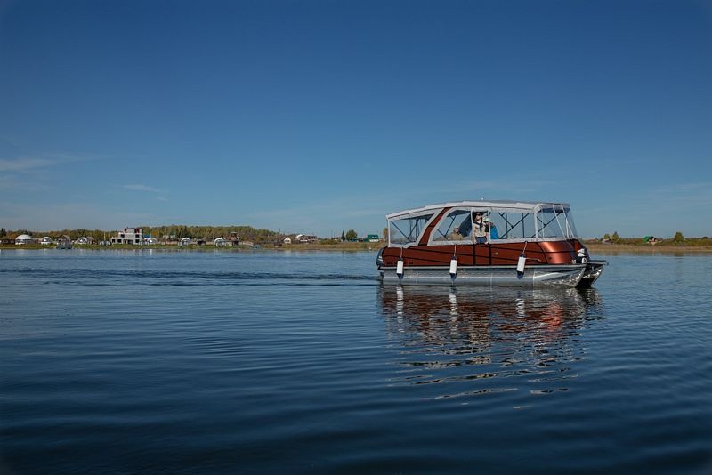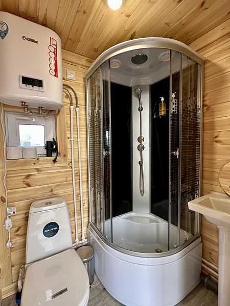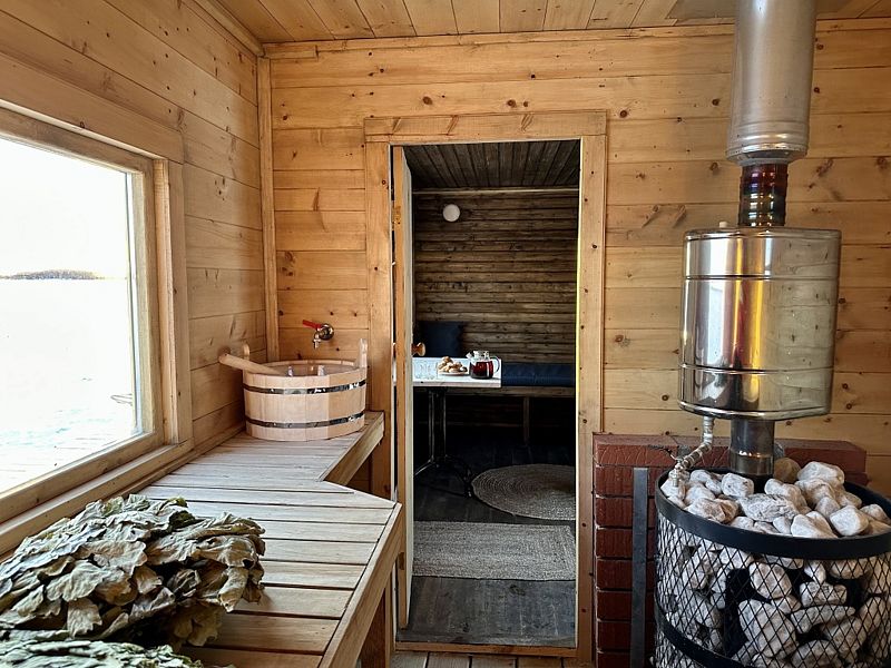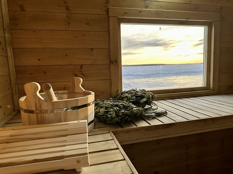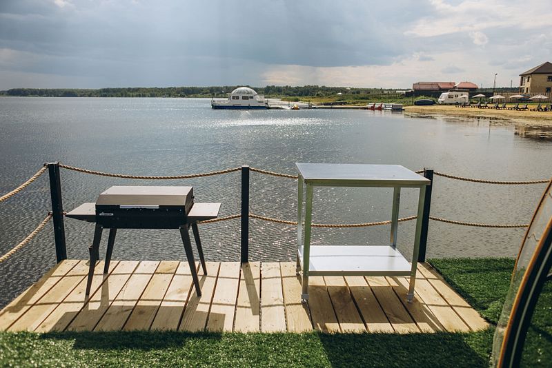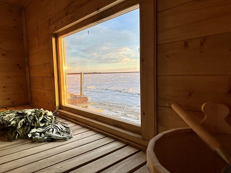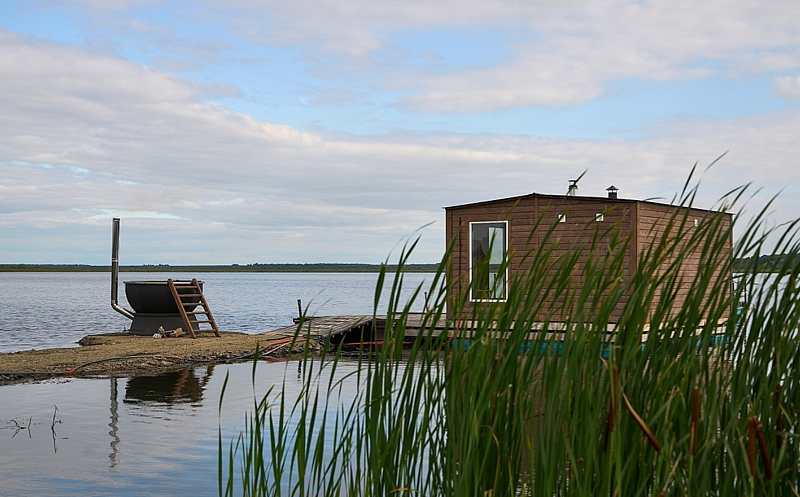 Баня и беседка установлены на понтонах и находятся прямо на воде, поэтому можно купаться прямо с палубы. Баня включает в себя парилку, помывочную и просторную комнату отдыха с принадлежностями для чаепития. Также имеется биотуалет. На террасе располагается прозрачная купольная беседка с мангалом, диваном и столом.Цена: