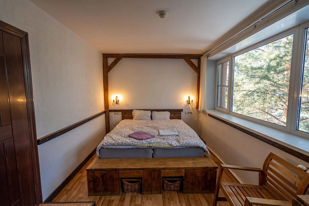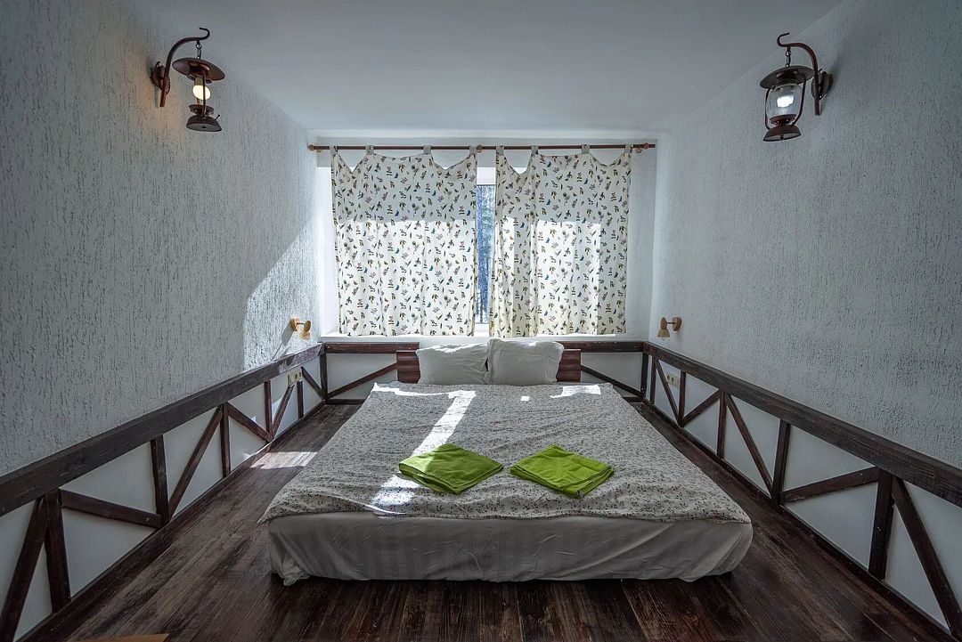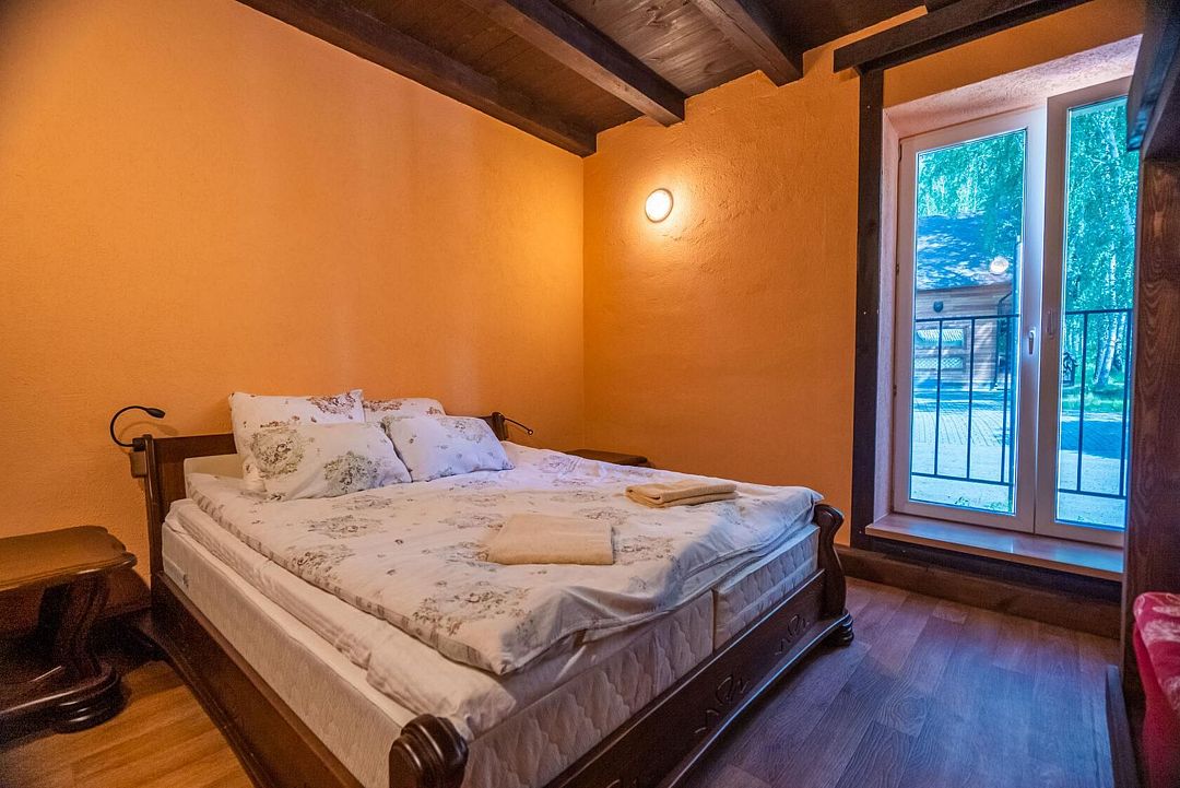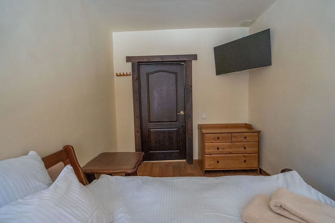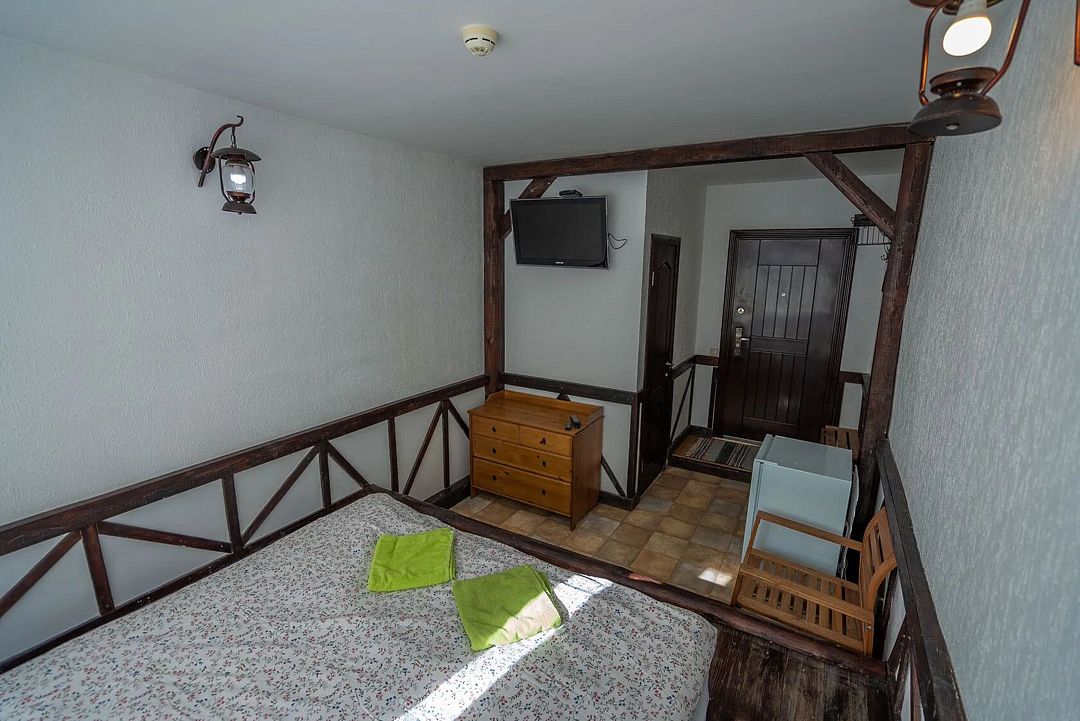 Уютные номера в главном здании гостиничного комплекса: двуспальная кровать 180 х 200 см, комплект постельного белья, полотенца, цифровое ТВ, мини-холодильник, санузел, душ на этаже, комод.