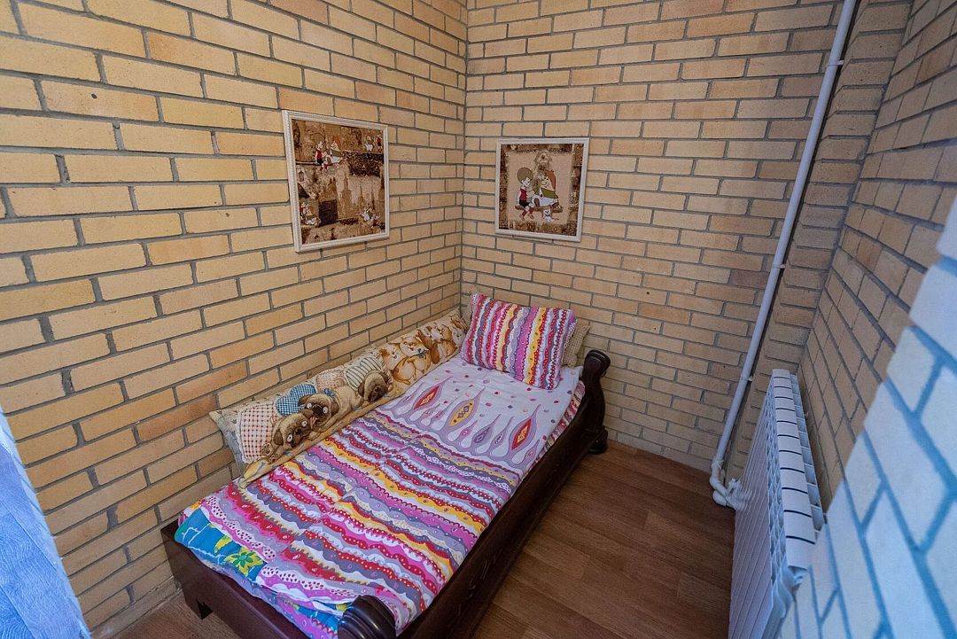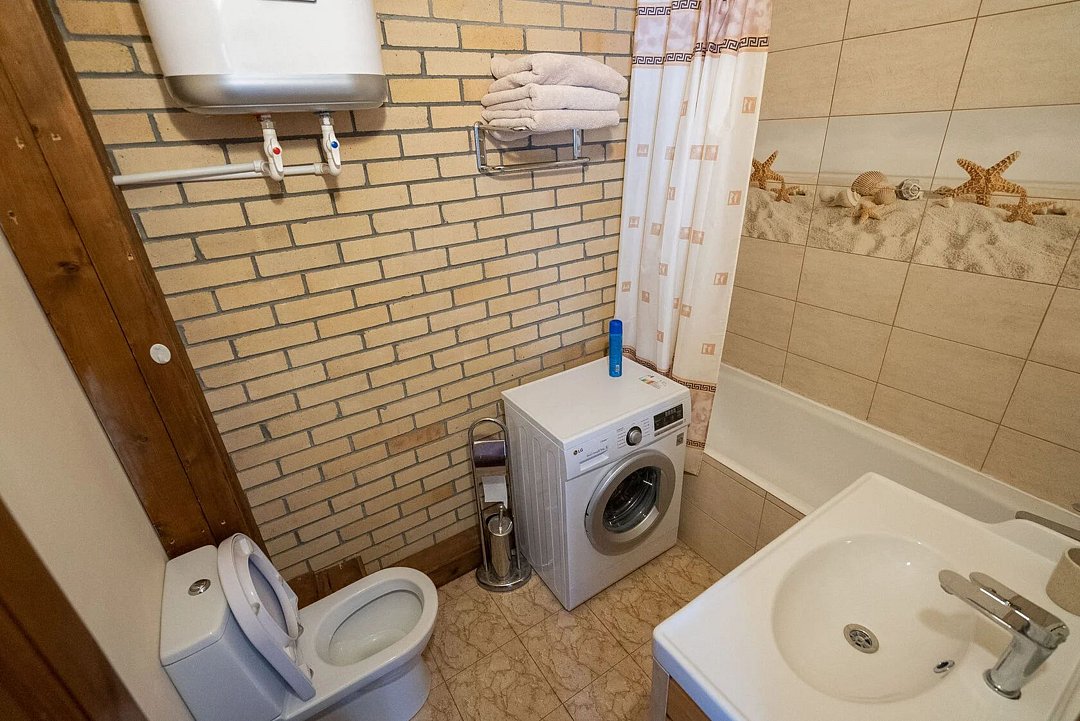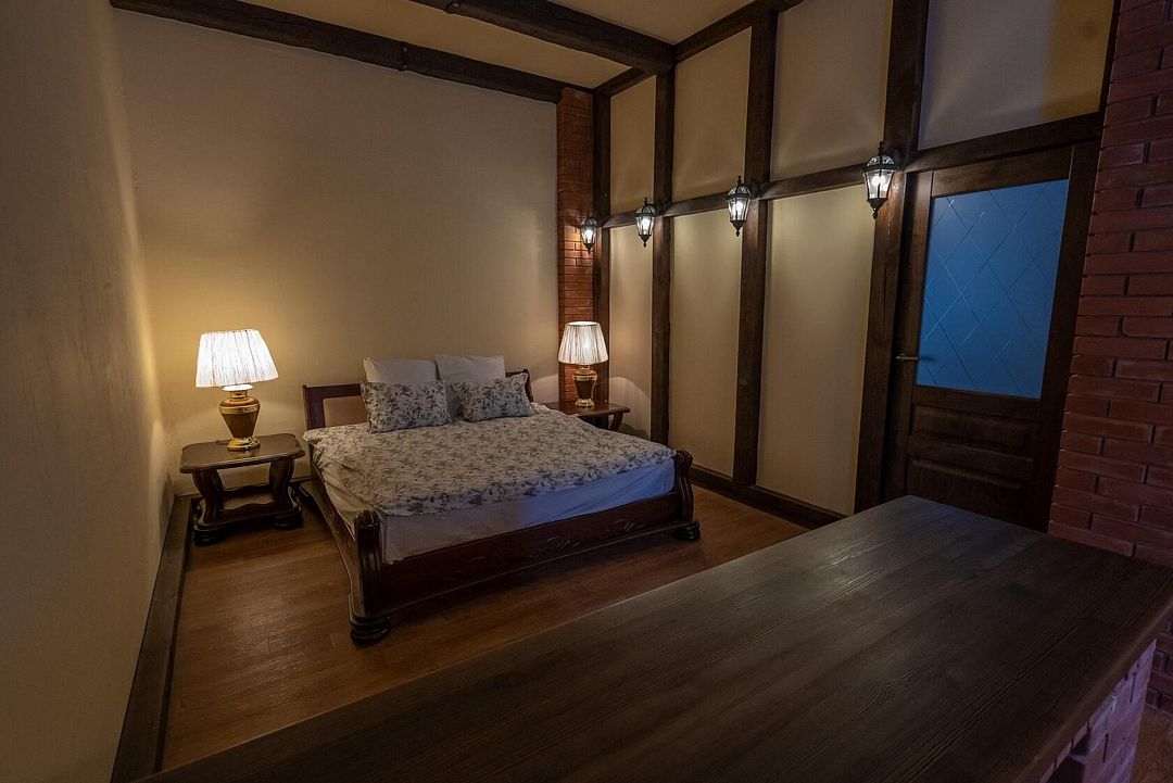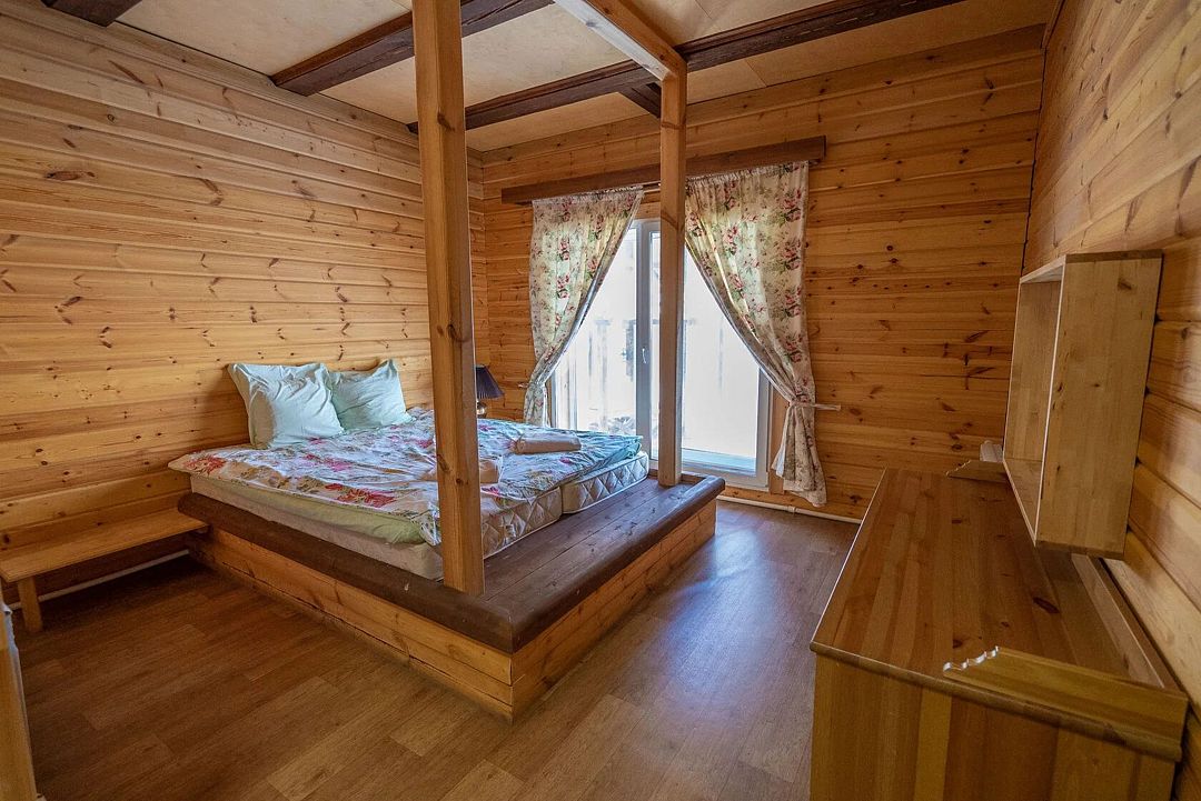 Двухэтажный дом на 12 человек со всеми удобствами. Первый этаж: 2 комнаты с двуспальной кроватью 180 х 200 см, 2 прикроватных столика с ночными лампами, комодом, косметическим столиком, стулом и санузлом (унитаз, умывальник, душ), комплект постельного белья с полотенцами.