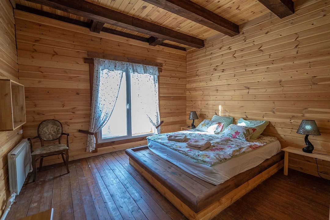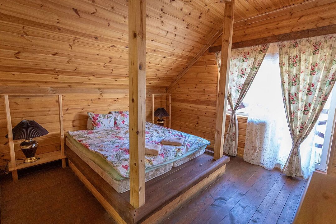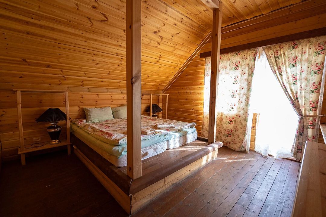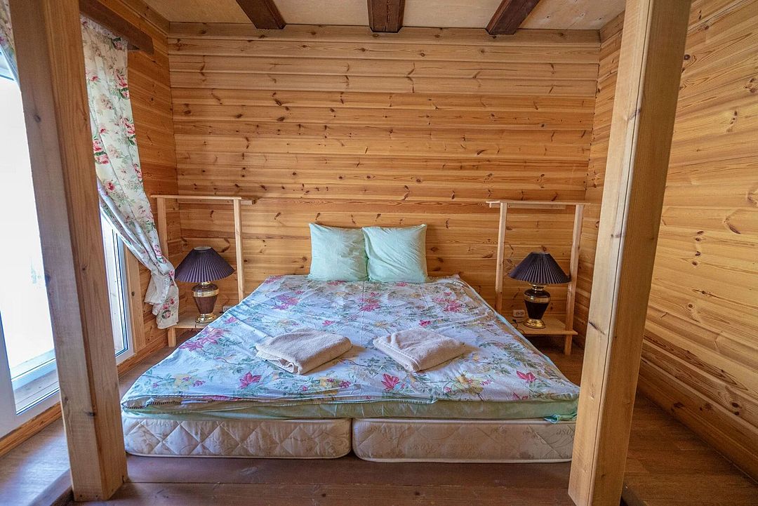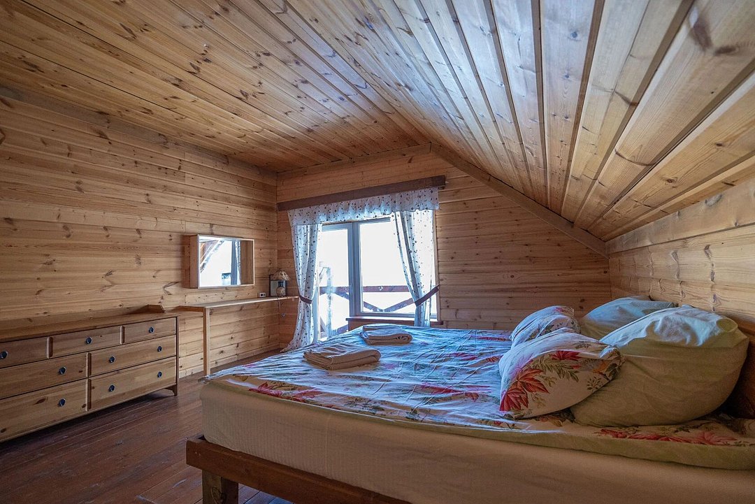 Второй этаж: 4 комнаты с двуспальной кроватью 180 х 200 см, 2 прикроватными лампами, комодом и санузлом (унитаз, умывальник, душ), комплект постельного белья с полотенцами, 2 балкона, цифровое ТВ; мангальная зона с застекленной беседкой и камином.