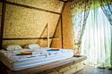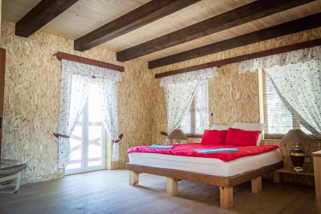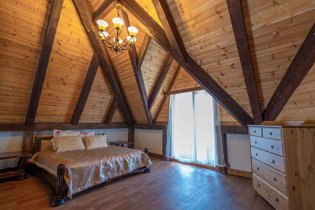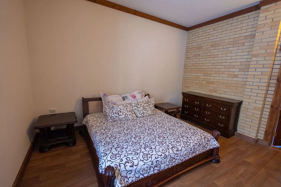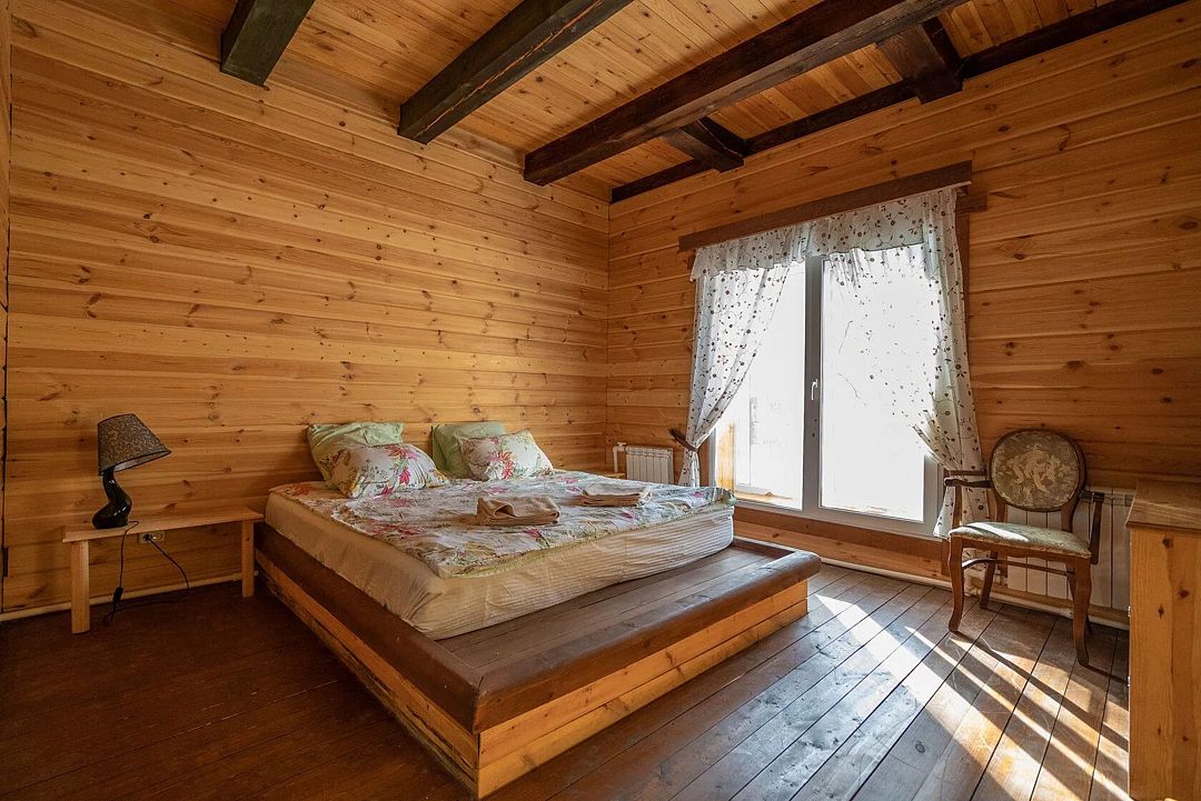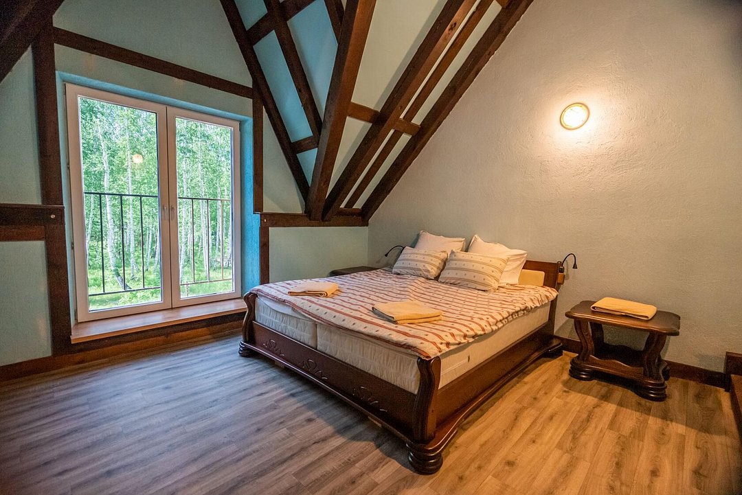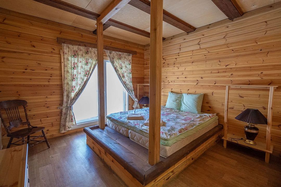 Второй этаж: 4 комнаты с двуспальной кроватью 180 х 200 см, 2 прикроватными лампами, комодом и санузлом (унитаз, умывальник, душ), комплект постельного белья с полотенцами, 2 балкона, цифровое ТВ; мангальная зона с застекленной беседкой и камином.