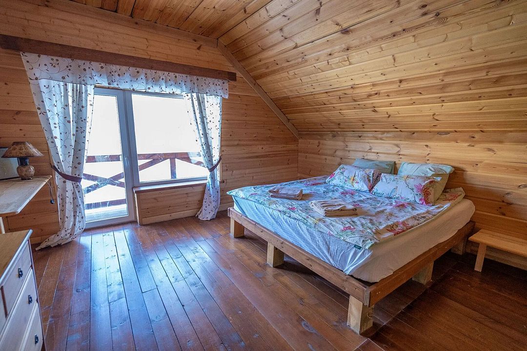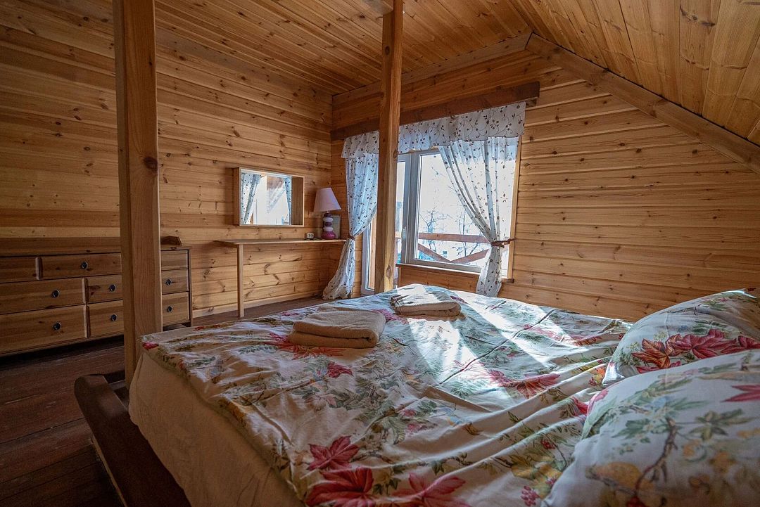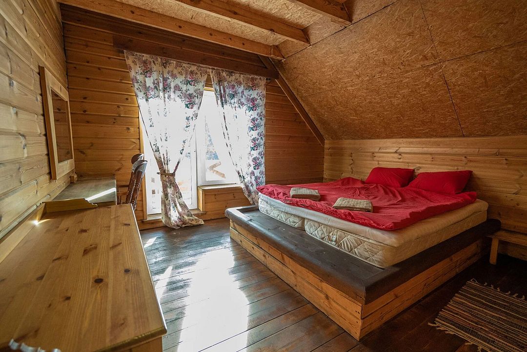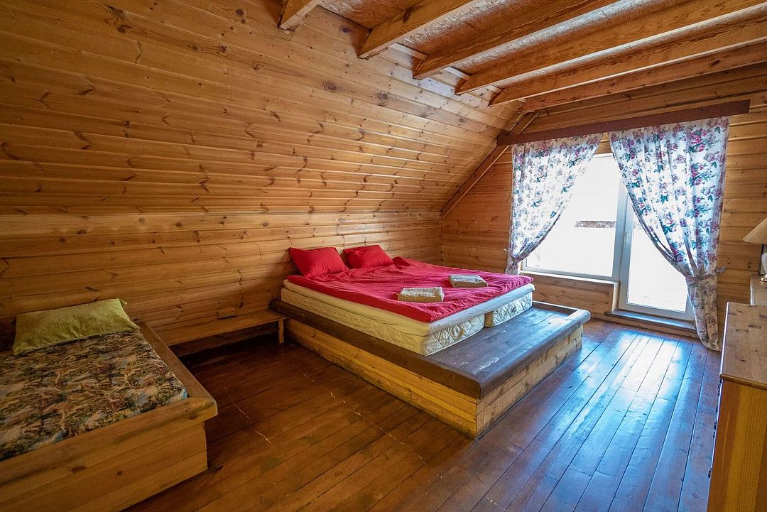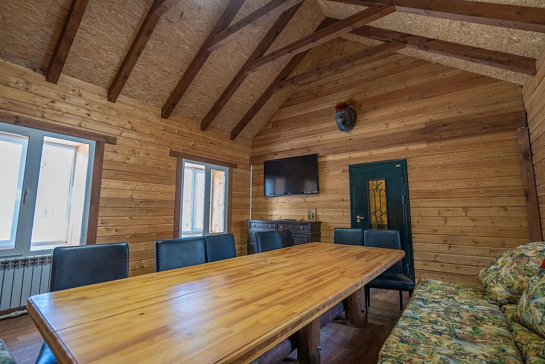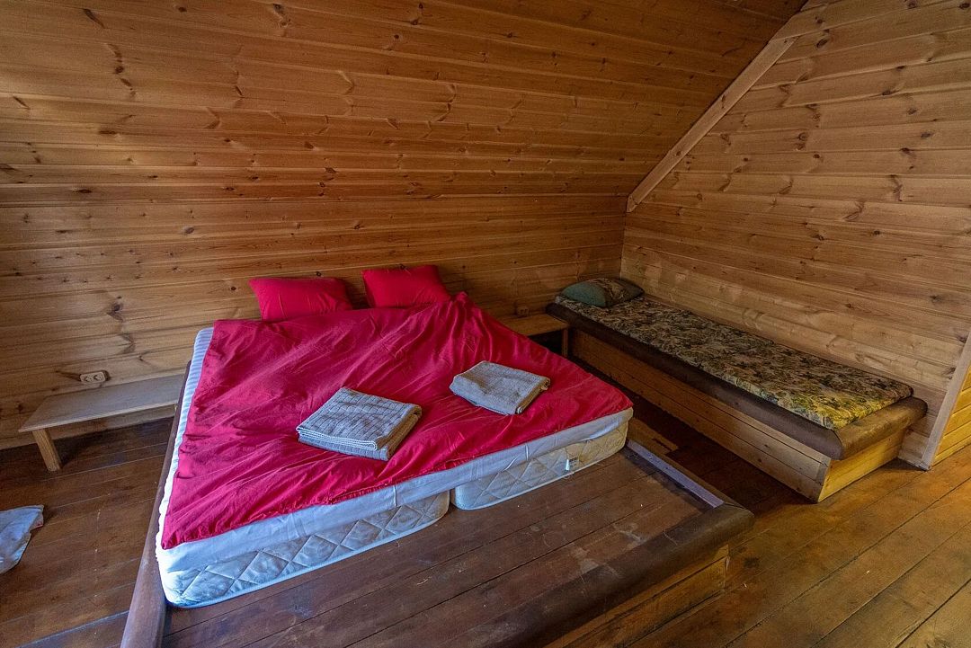 Двухэтажный дом на 3 пары с детьми. Первый этаж: 1 комната с двуспальной кроватью 180 х 200 см и комодом, комплект постельного белья с полотенцами, общая гостиная с кухонной зоной (холодильник, четырехкомфорочная плита, наборы кухонной и столовой посуды), обеденный стол и 4 стула, санузел (унитаз, умывальник, душевая кабина), цифровое ТВ.
