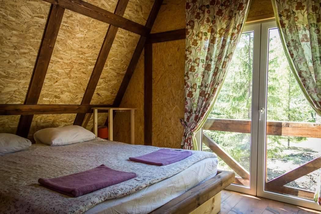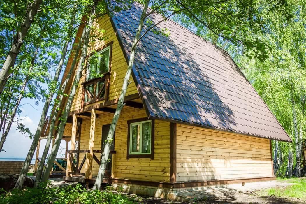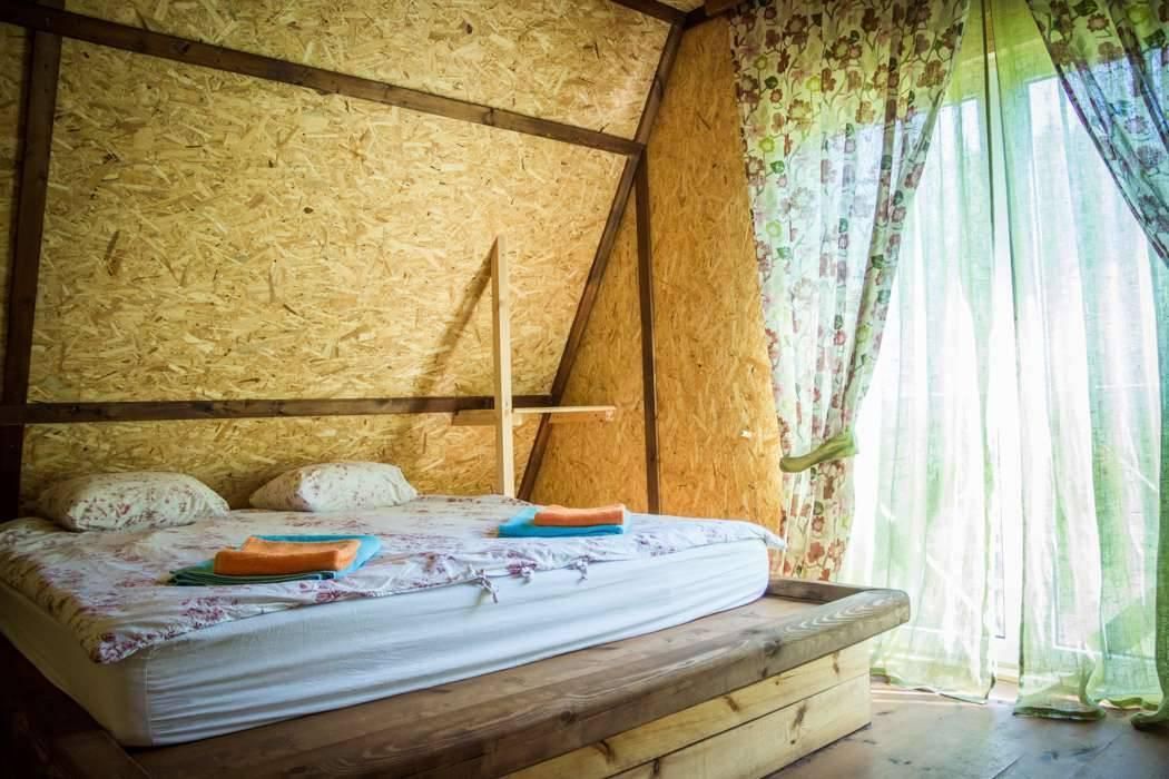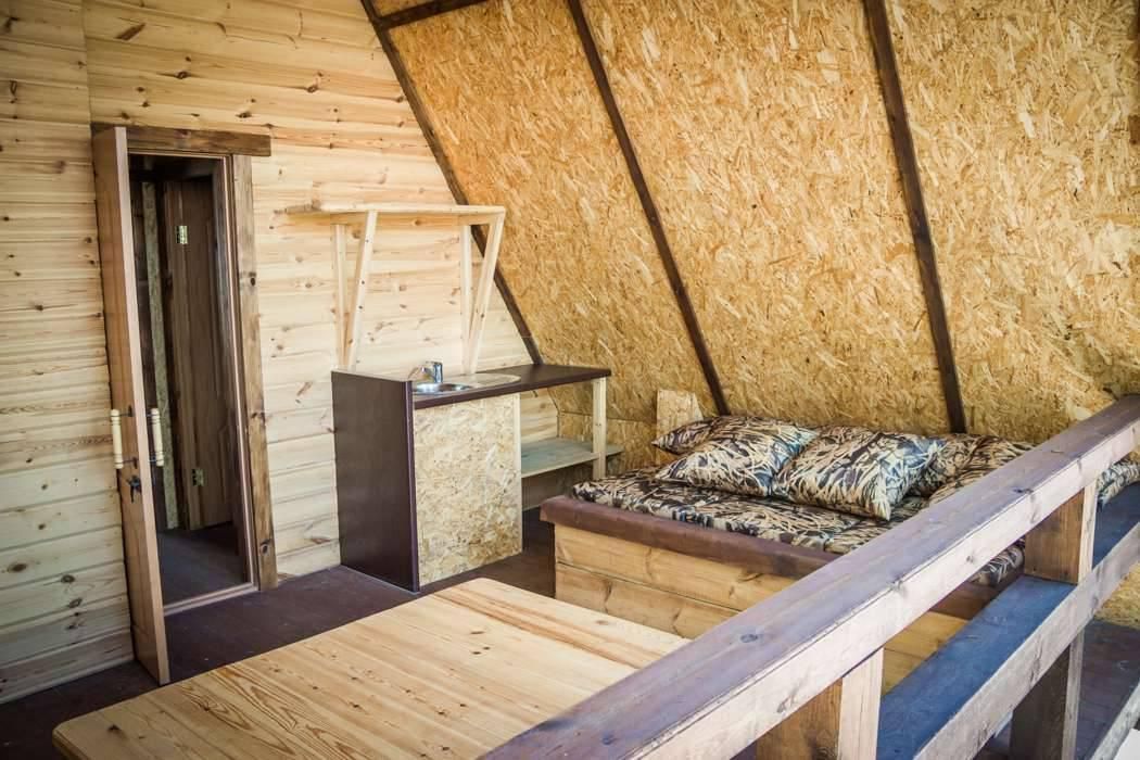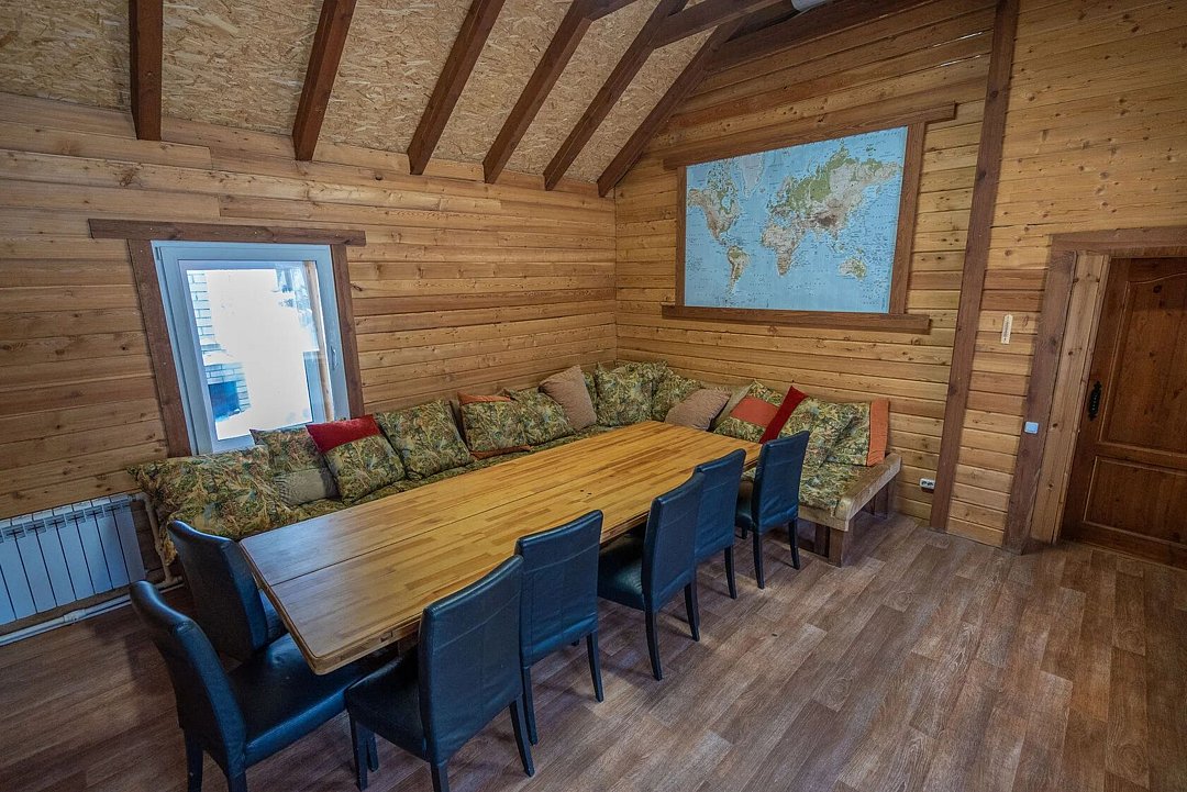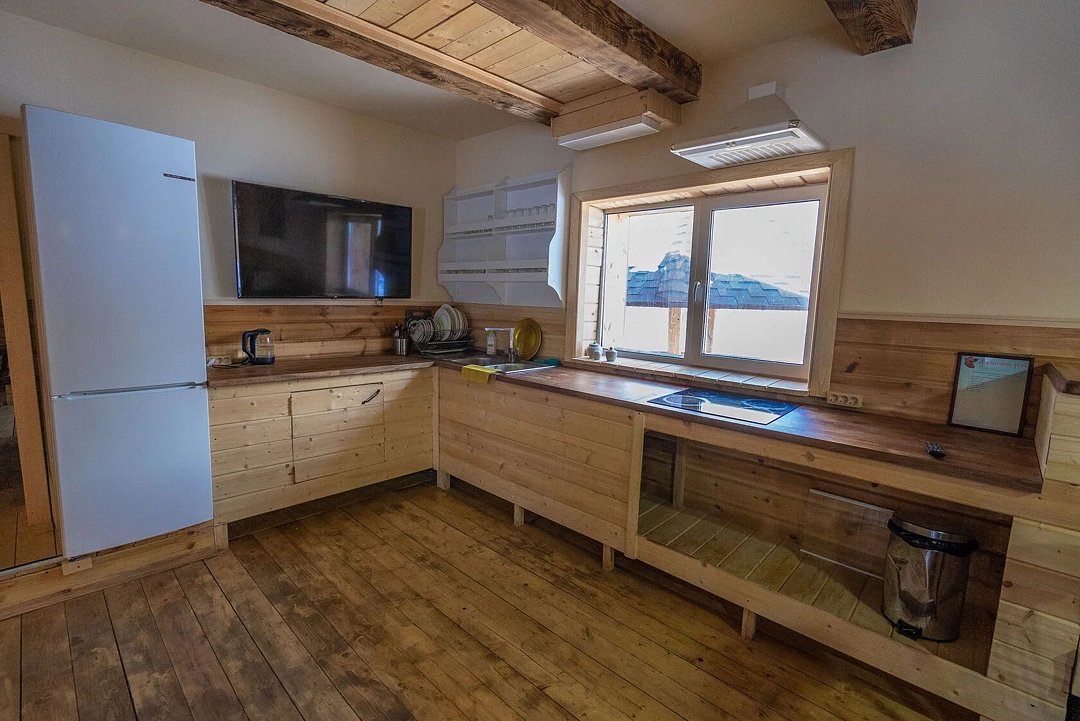 Двухэтажный дом на 3 пары с детьми. Первый этаж: 1 комната с двуспальной кроватью 180 х 200 см и комодом, комплект постельного белья с полотенцами, общая гостиная с кухонной зоной (холодильник, четырехкомфорочная плита, наборы кухонной и столовой посуды), обеденный стол и 4 стула, санузел (унитаз, умывальник, душевая кабина), цифровое ТВ.