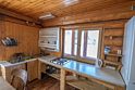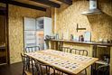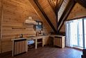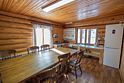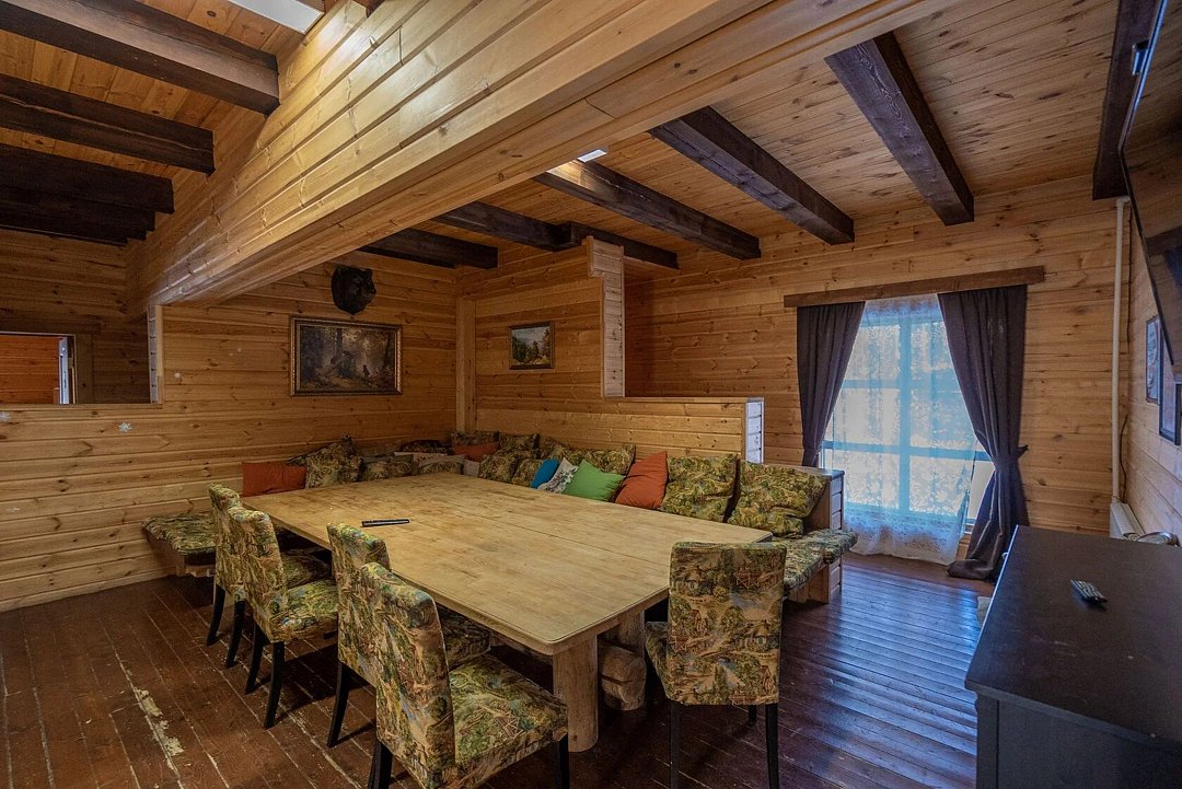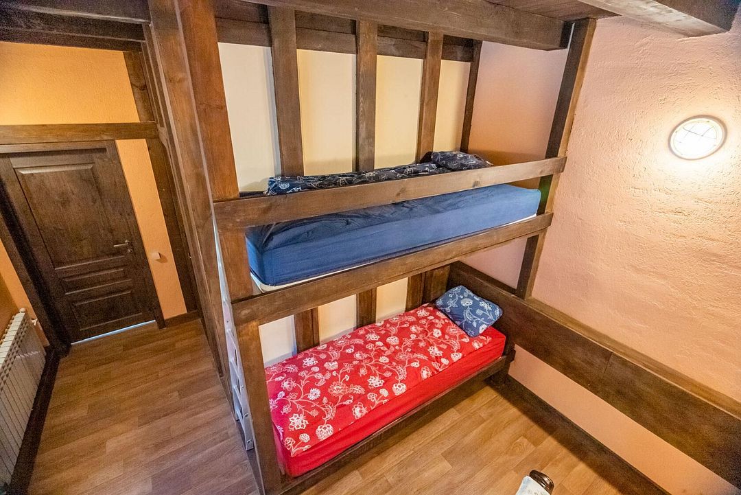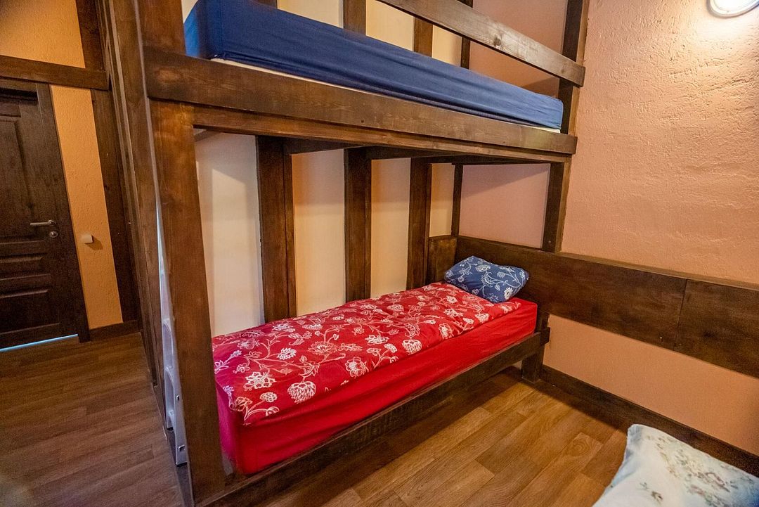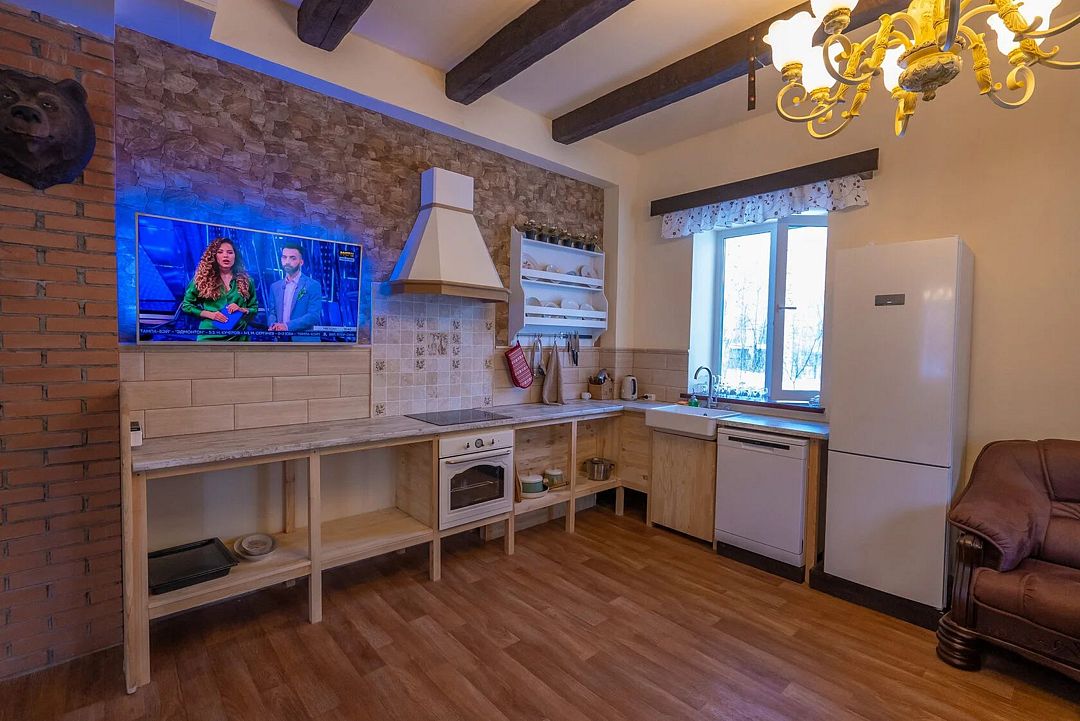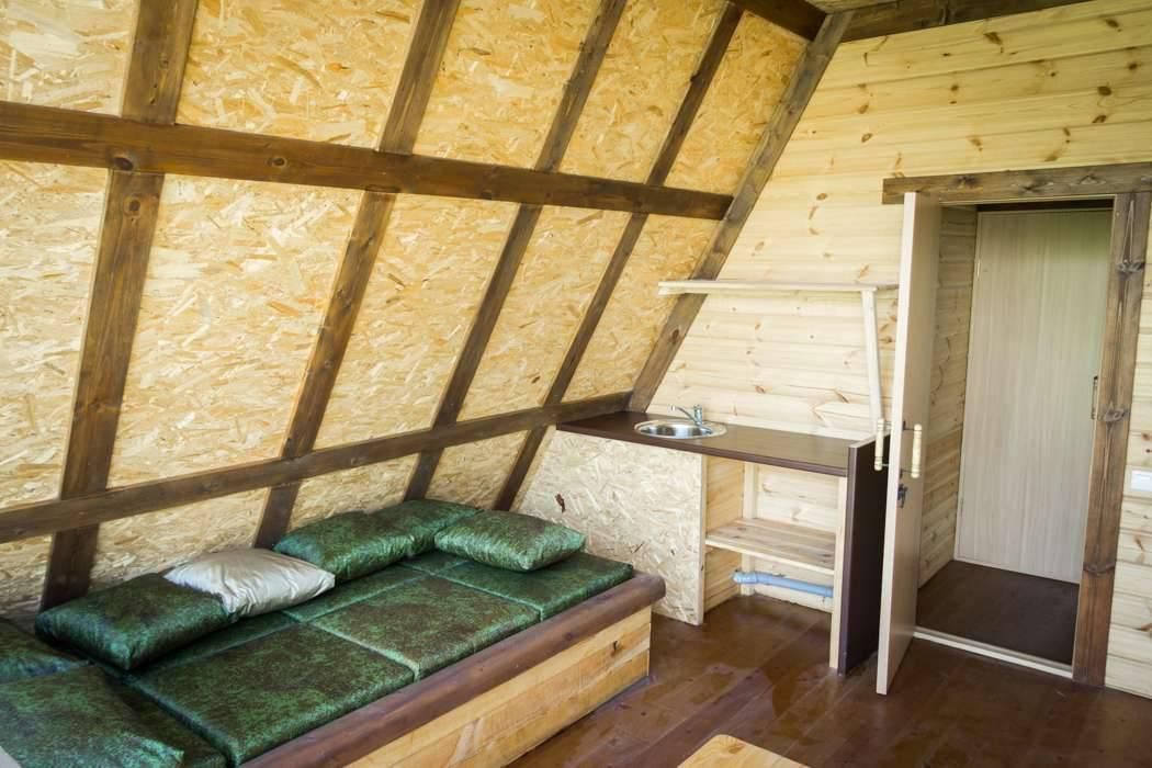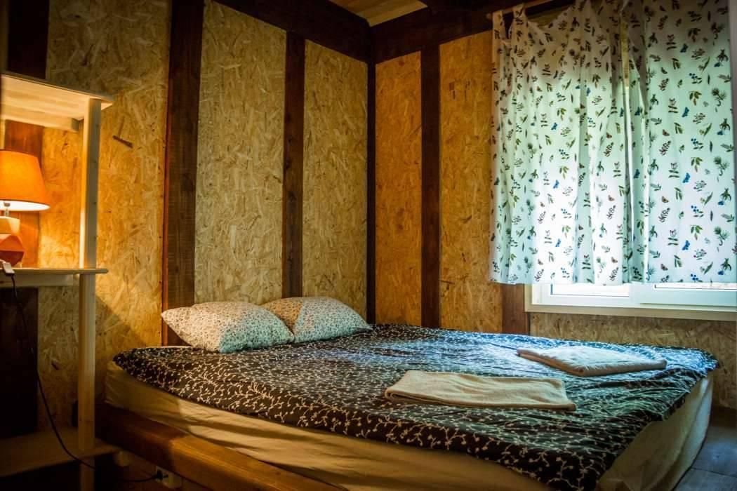 Двухэтажный дом на 3 пары с детьми. Первый этаж: 1 комната с двуспальной кроватью 180 х 200 см и комодом, комплект постельного белья с полотенцами, общая гостиная с кухонной зоной (холодильник, четырехкомфорочная плита, наборы кухонной и столовой посуды), обеденный стол и 4 стула, санузел (унитаз, умывальник, душевая кабина), цифровое ТВ.