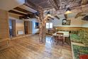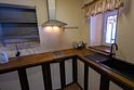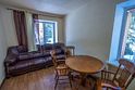 Апартаменты в трехэтажном доме на 6 номеров. Первая комната: кухонная зона (холодильник, четырехкомфорочная плита, набор кухонной и столовой посуды), обеденная зона с диваном, стульями и столом, цифровое ТВ.