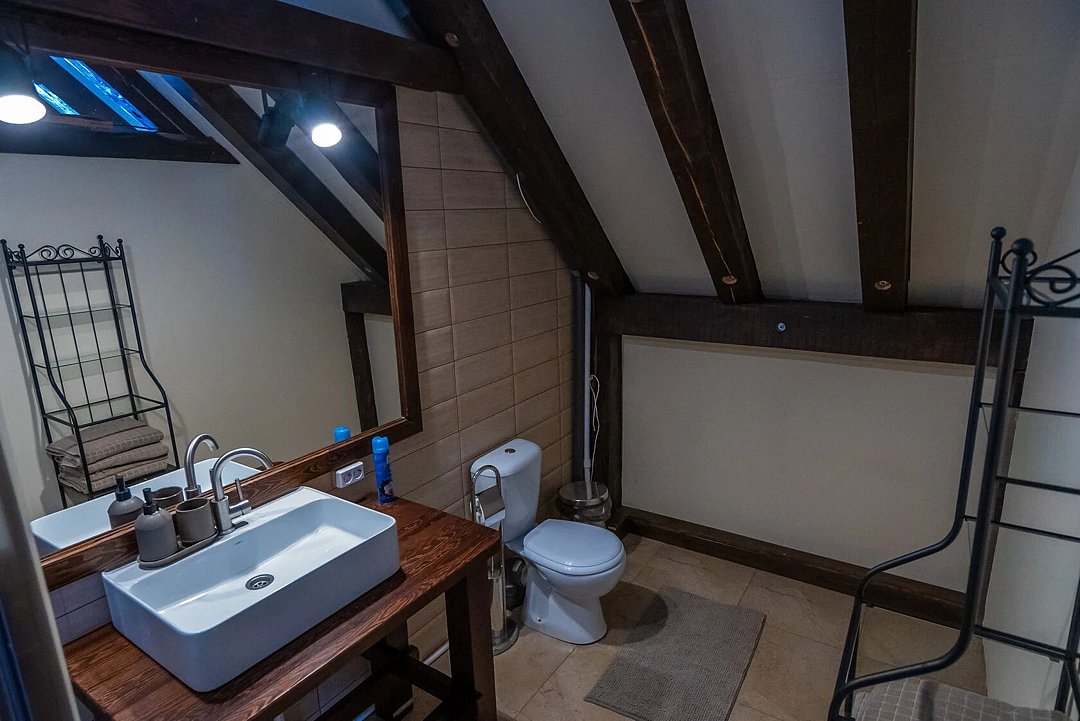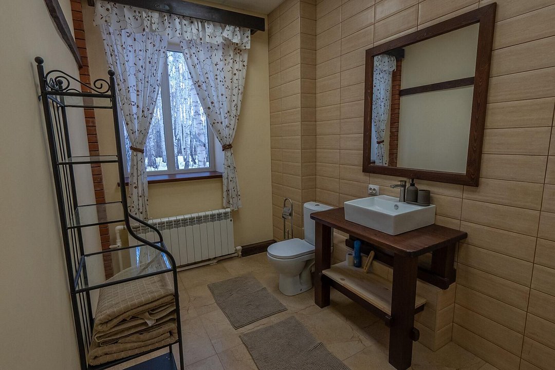 Второй этаж: 2 комнаты с двуспальной кроватью 180 х 200 см и комодом, комплект постельного белья с полотенцами, санузел в каждой комнате (унитаз, умывальник, душевая кабина), в каждой жилой комнате есть диван; мангальная зона с беседкой.