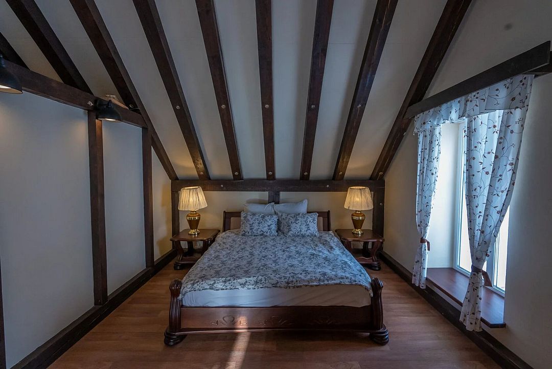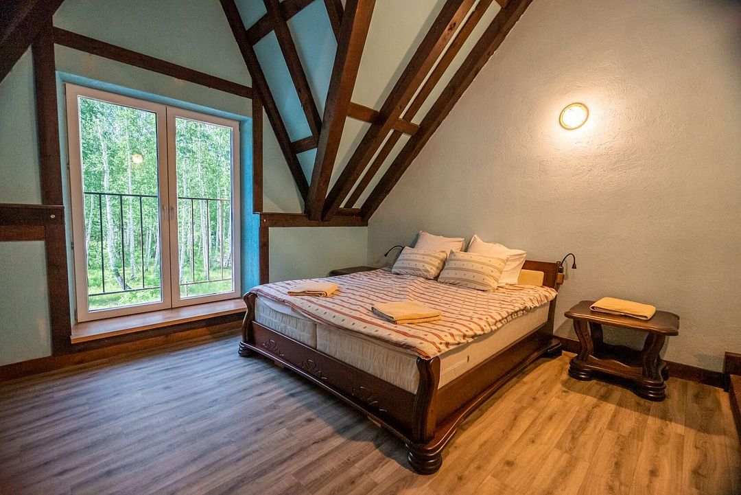 Второй этаж: 4 комнаты с двуспальной кроватью 180 х 200 см, 2 прикроватными лампами, комодом и санузлом (унитаз, умывальник, душ), комплект постельного белья с полотенцами, 2 балкона, цифровое ТВ, мангальная зона с беседкой и камином.